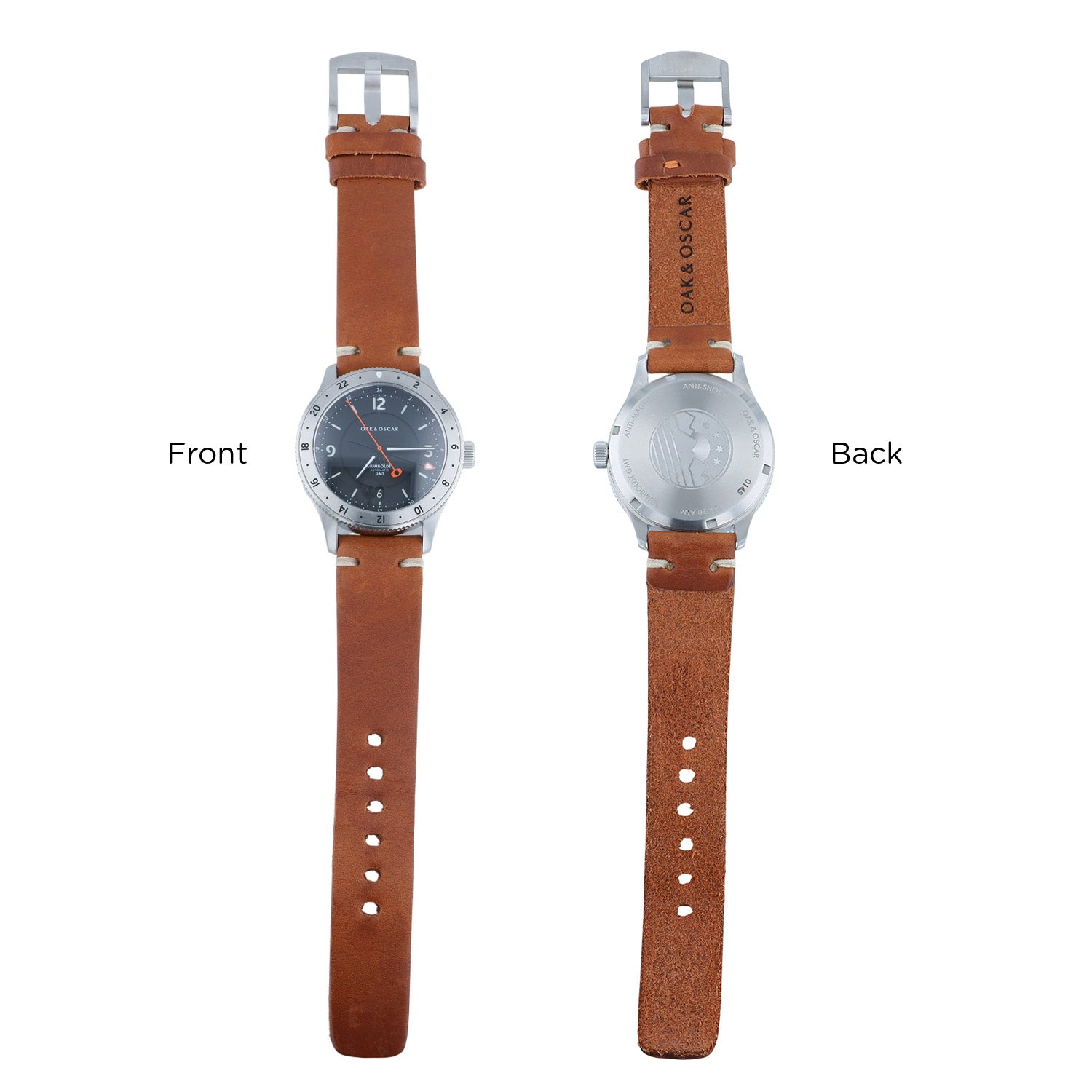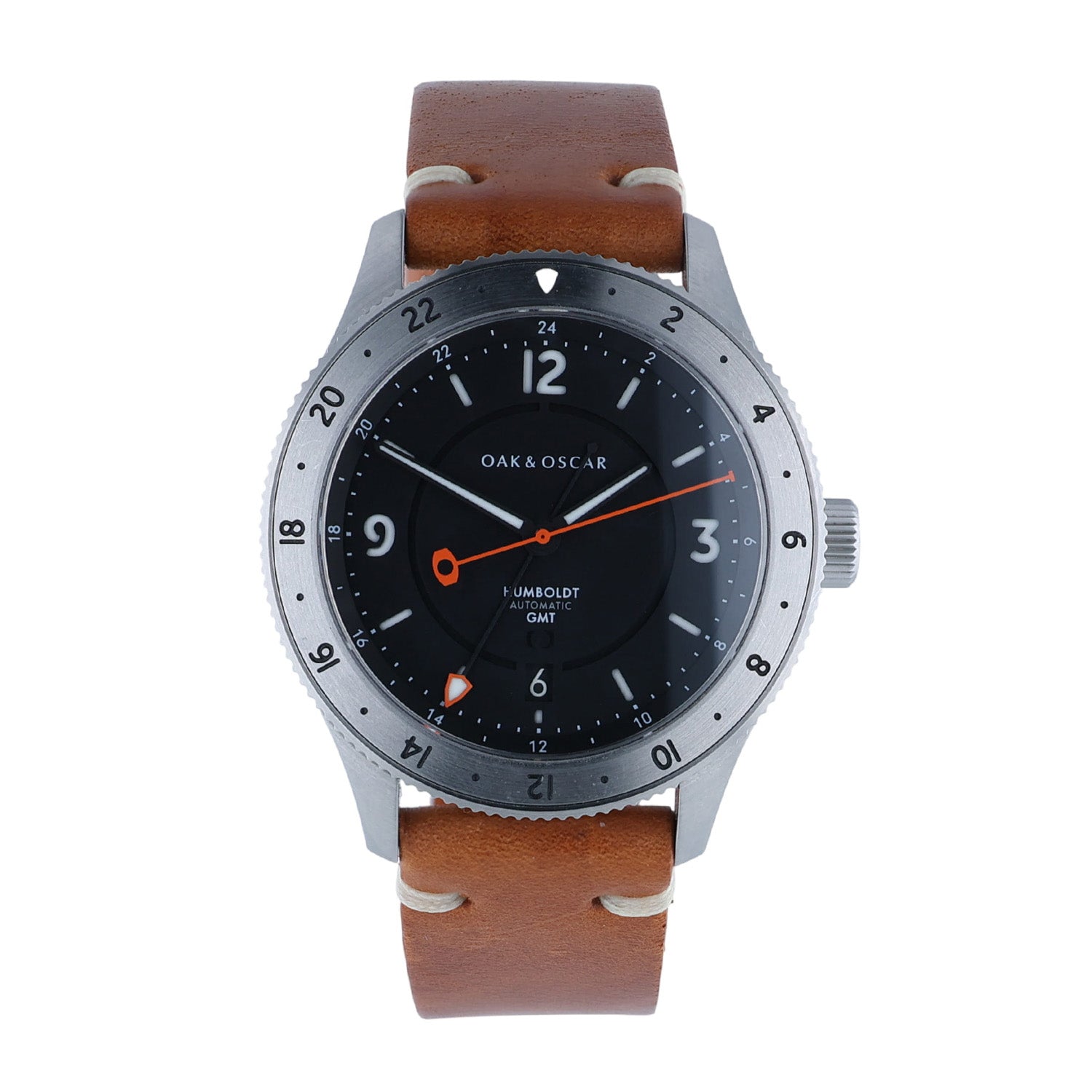 Pre-Owned Oak & Oscar 40MM Stainles Steel The Humboldt GMT Black Arabic Brown Strap