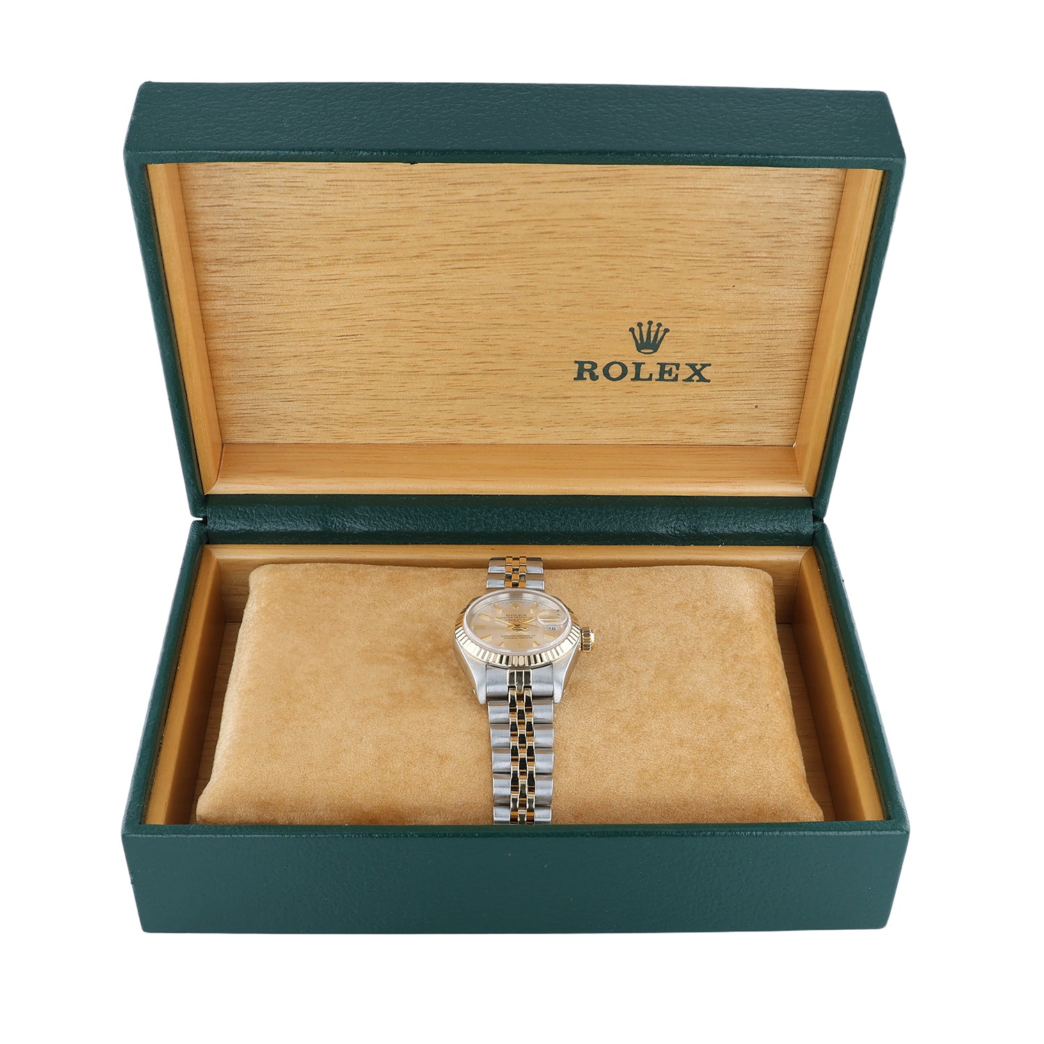 The Rolex Datejust 69173 presents a 26mm stainless steel and 18k yellow gold case with a silver stick dial and a graceful Jubilee bracelet. Powered by an automatic movement with a 42-hour power reserve, it ensures accuracy and dependability. Water resistant to 100m/330 feet, this elegant model reflects the refined style and quality that define Rolex. Comes with its original box and papers.