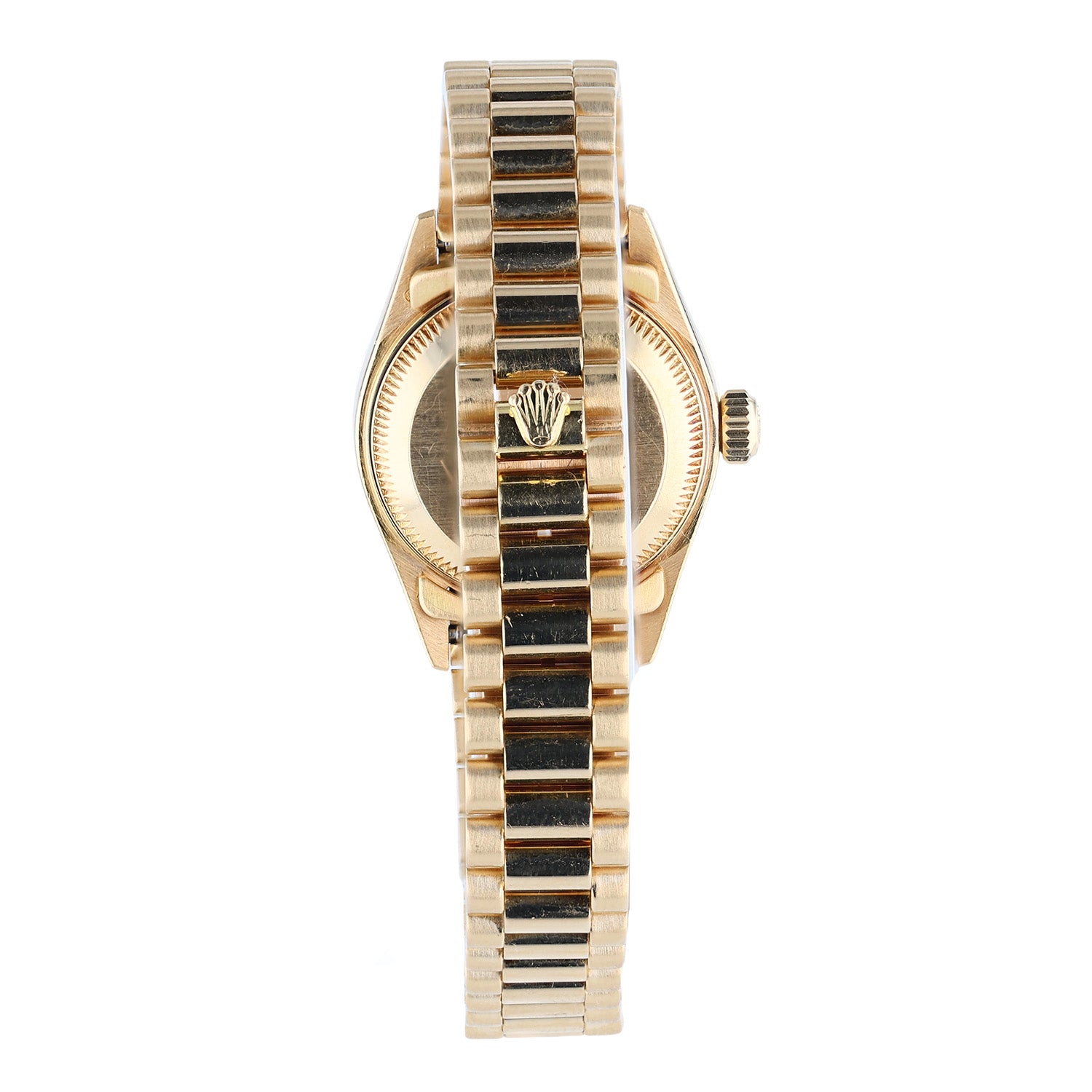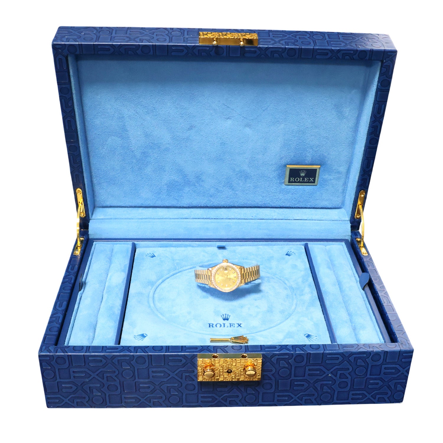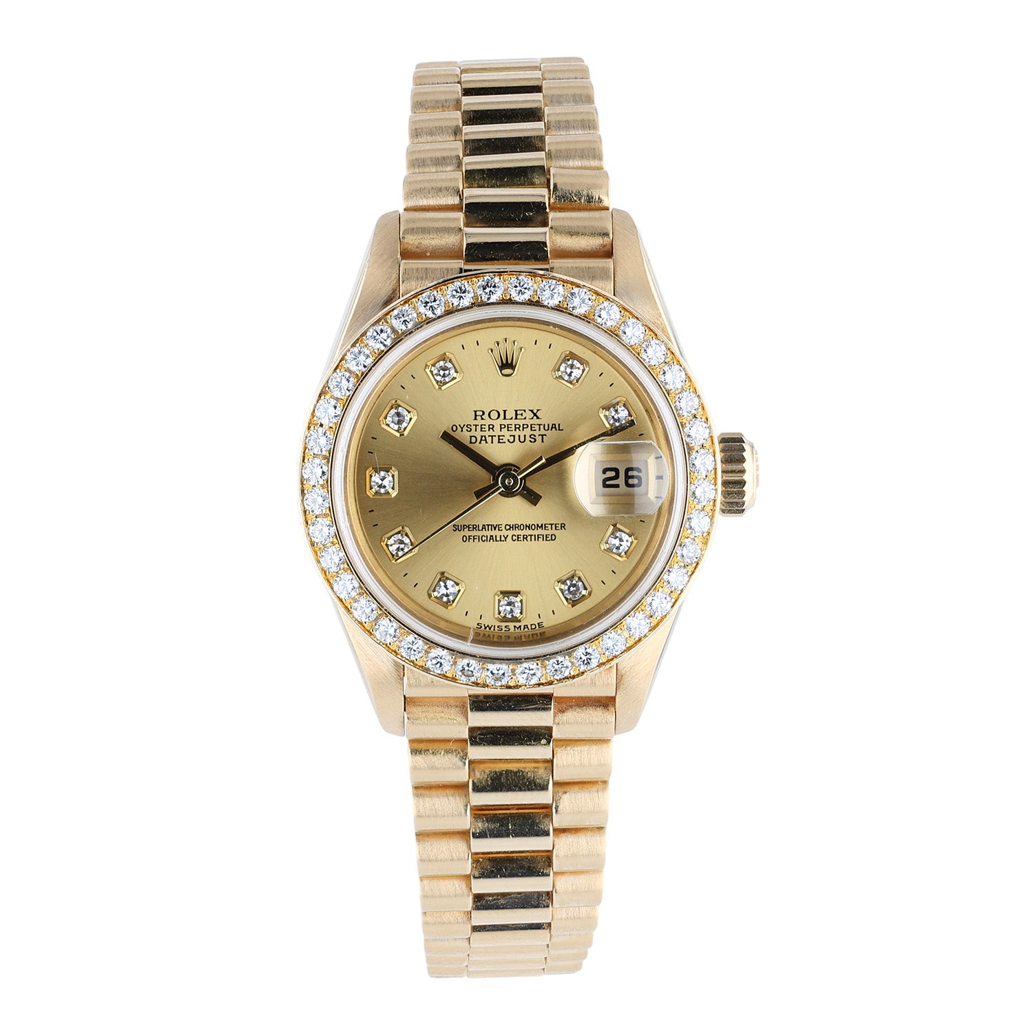 The Pre-Owned Rolex 18K yellow gold Lady-Datejust with a factory diamond bezel and Champagne diamond dial combines elegance and brilliance in perfect harmony. The President bracelet adds a refined touch, and the automatic movement provides a power reserve of approximately 48 hours. Built for everyday luxury, it is water-resistant up to 100m/330 feet and comes with its original Rolex box.