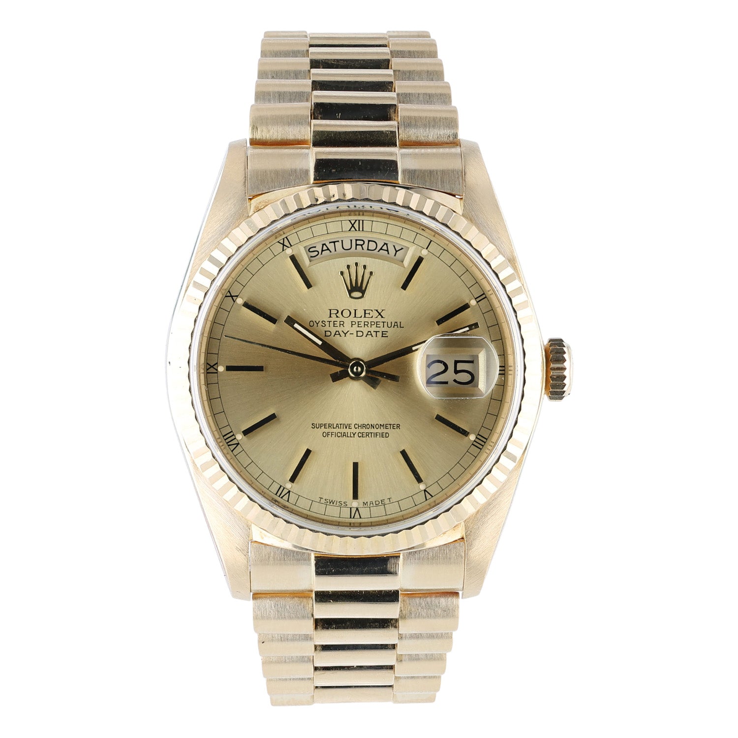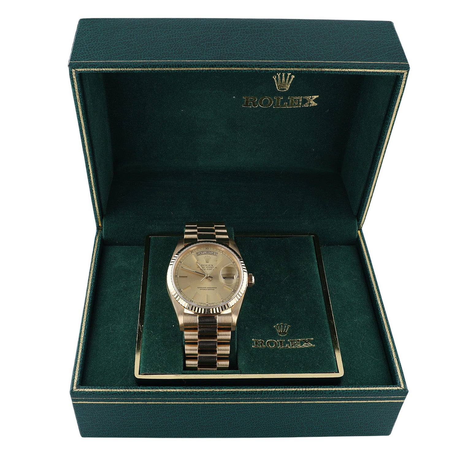 Pre-Owned Rolex 36mm Yellow Gold Day Date Champagne dial President Bracelet.