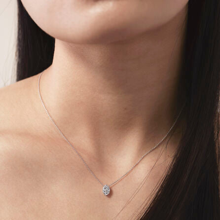 Navette is another term to describe a jewelry contour. Pointed at both ends with equally curved sides. Seamless, irregular pave to create a classic, but unique cluster look. Tapered from top to bottom to enhance the appearance of pure sparkle from the top view and help the pendant lay flush against the skin. Beautifully honey-combed back plating, mirrored inside and out for more luxurious finishing details.