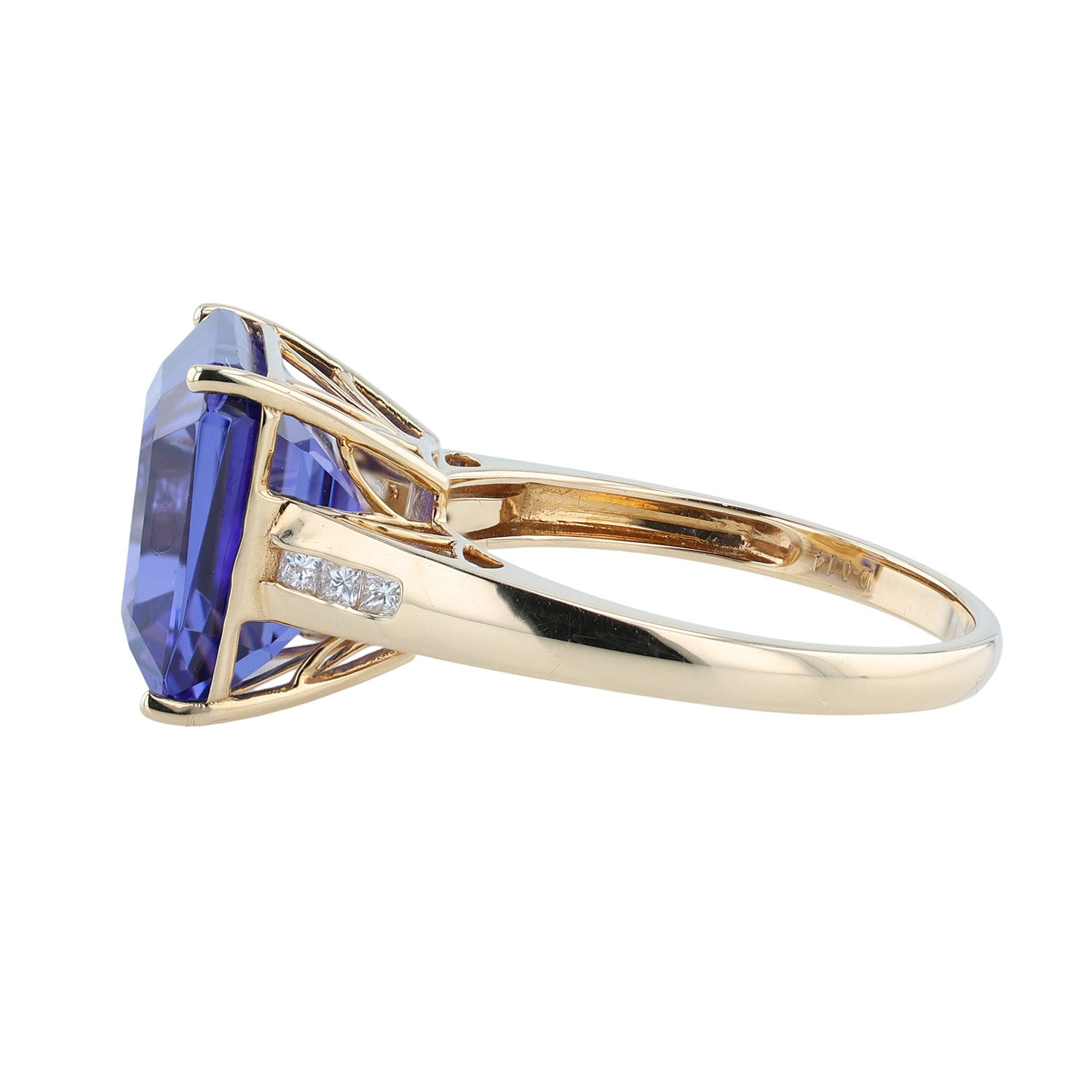 From the Bella Cosa Jewelers estate collection. This tanzanite and diamond ring features a 13.89 carat tanzanite and 0.14 carats of diamonds that are G to H in color and SI1 to SI2 in clarity. Gemstone weights are estimated. This diamond and tanzanite ring has been set in 18K yellow gold and measures a size 11.