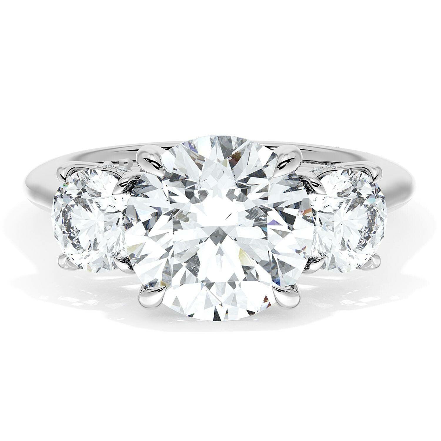 This three stone ring on a high polish band features a round brilliant center and matching round side stones, each accented with a hidden bloom. The ring is finished with a diamond-studded Signature Crescent.
