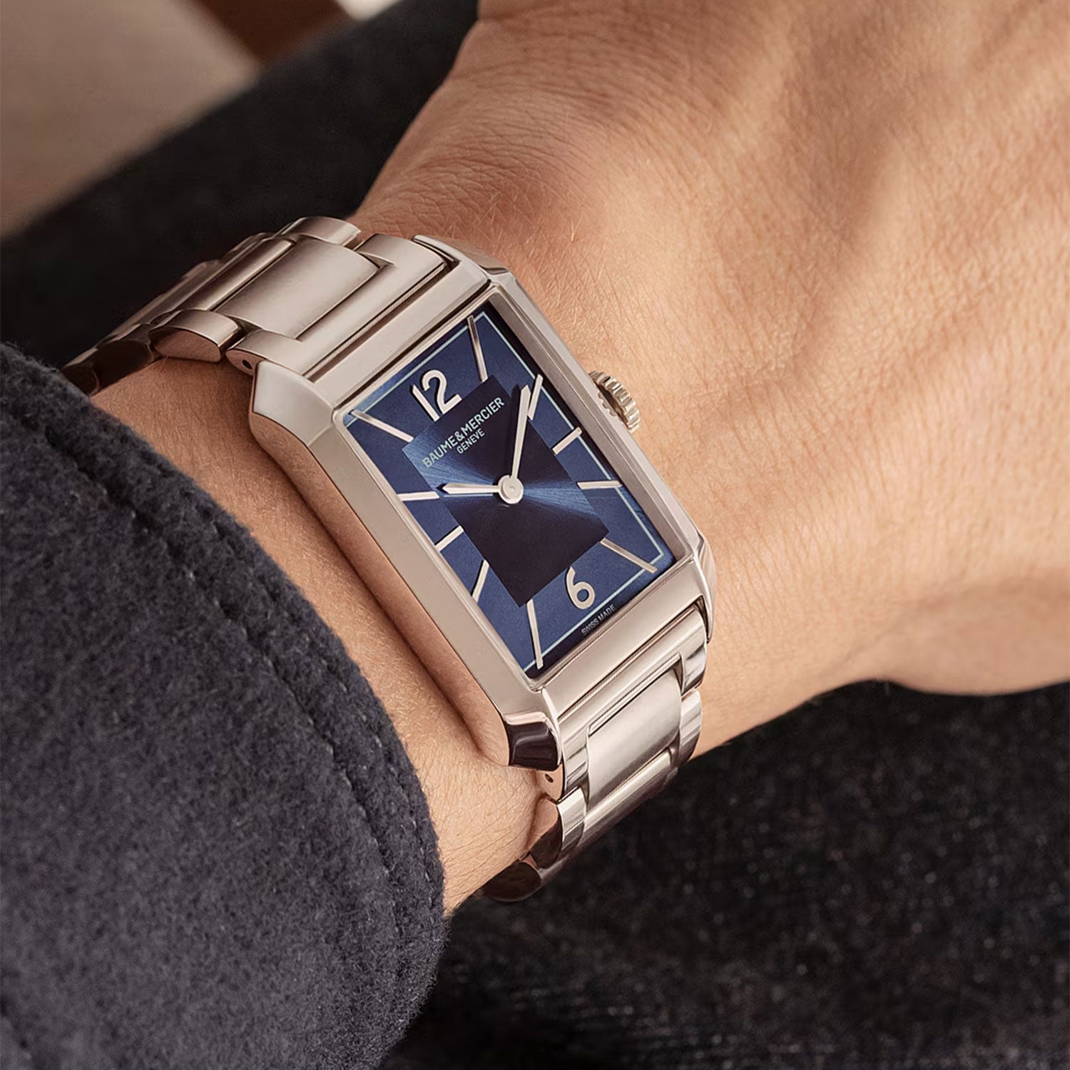 The rectangular shape of this timepiece reveals a harmonious rhythm that is both uniform and filled with contrasts, featuring subtle alternations of steel, gray and blue; polished and satin-finished surfaces; and vertical and horizontal lines along the strap. The rhodium-plated riveted numbers and indexes are elegantly indicated by sword-shaped hands. They extend towards the white minute track, reaching the inner tips of the riveted, rhodium-plated Arabic numerals and indexes. The opaline and sun satin-finished blue dial that delicately adorns the dial highlights each detail of this sought-after graphic composition.