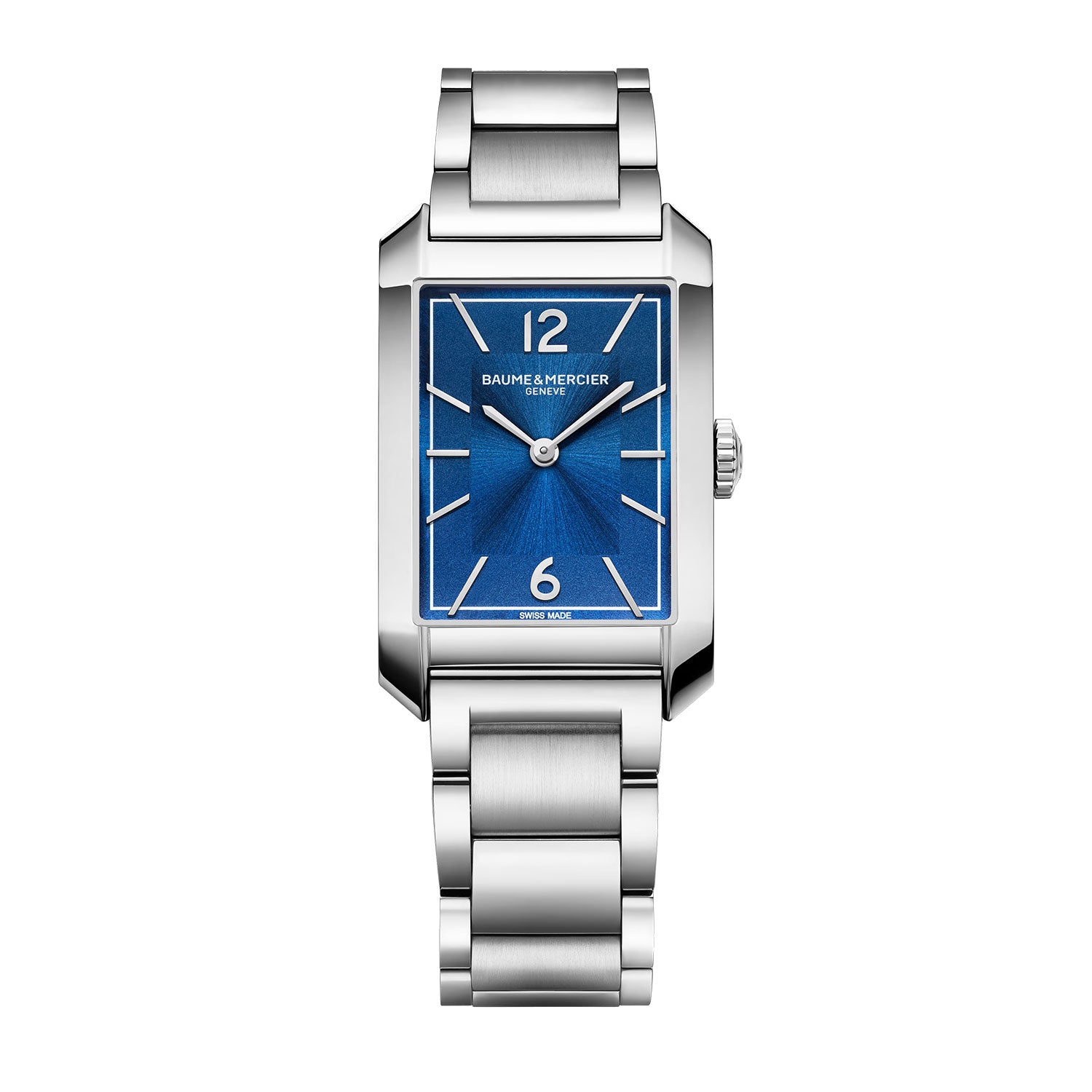 This quartz Hampton timepiece balances elegance with excellence in watchmaking. It comes with an opaline and sun satin-finished blue dial and grey minute line. The sleek rectangular stainless steel case is complemented by an interchangeable integrated 3-row polished and satin-finished stainless steel bracelet.