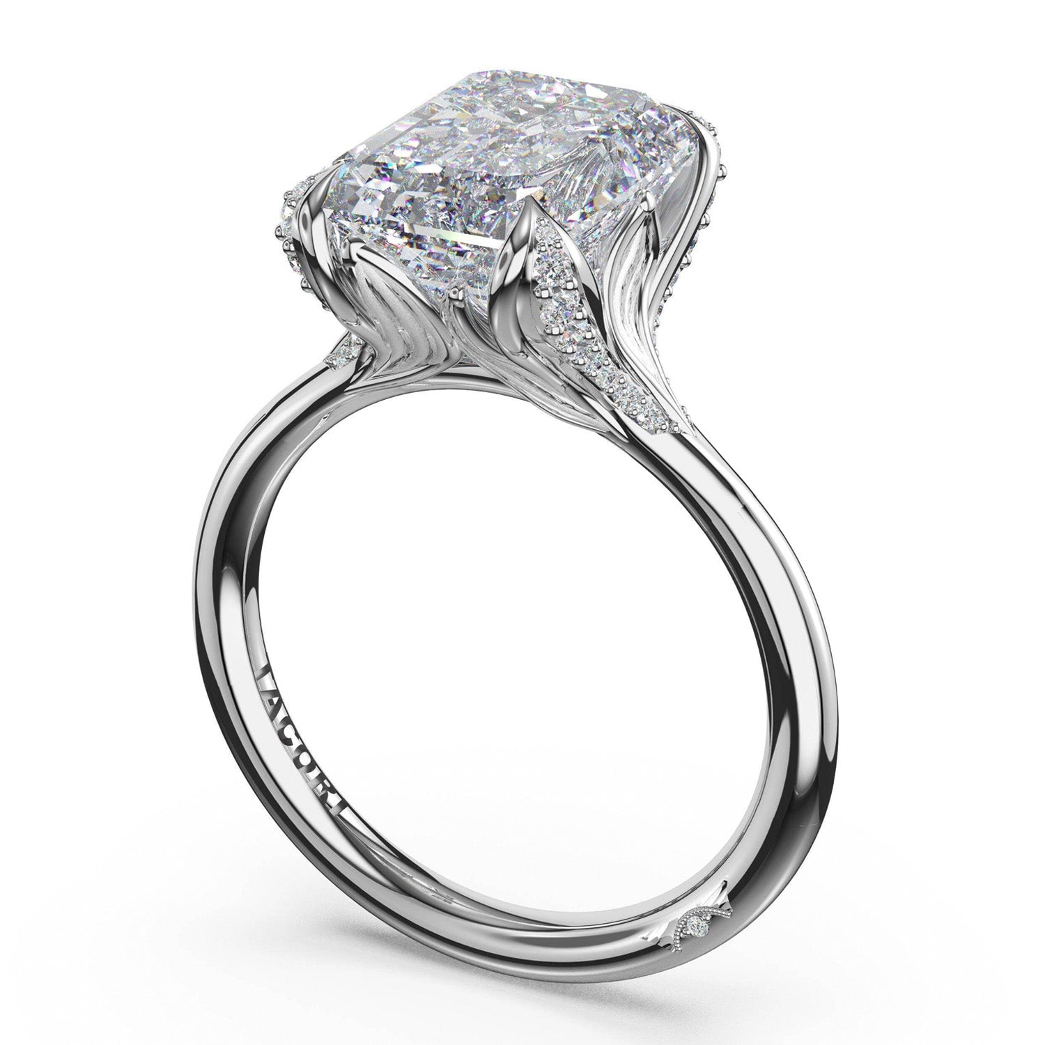 Deconstructed Dahlia petals, traced in pavé diamonds, unfold toward a emerald-cut center stone. Organic texture blooms across the metal, softening structure into natural form on a high-polish white gold foundation.