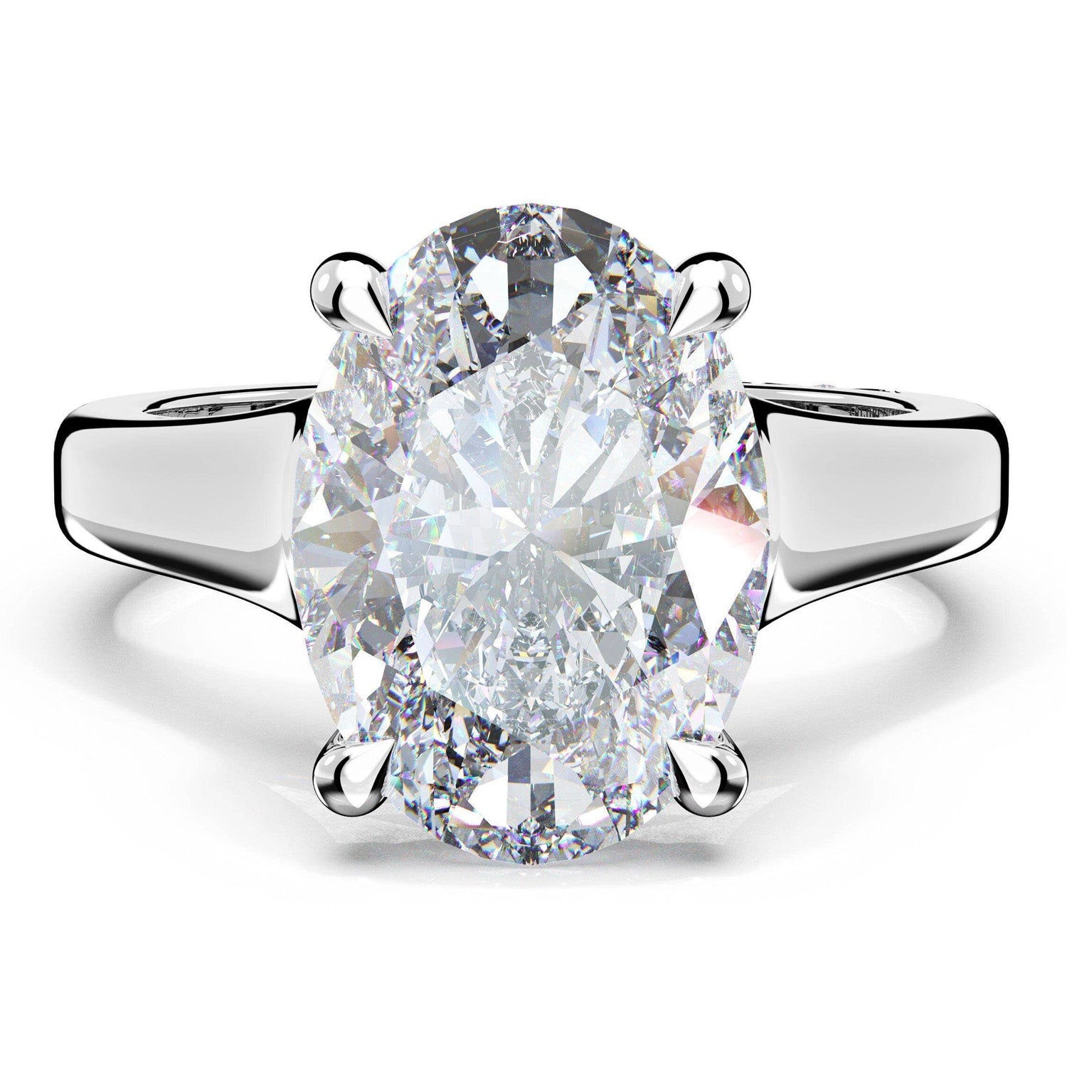 The wide high-polish platinum foundation makes a bold statement, accented with pavé diamonds that sparkle along the open crown of the oval-cut center stone, creating luminous depth and dimensional brilliance.