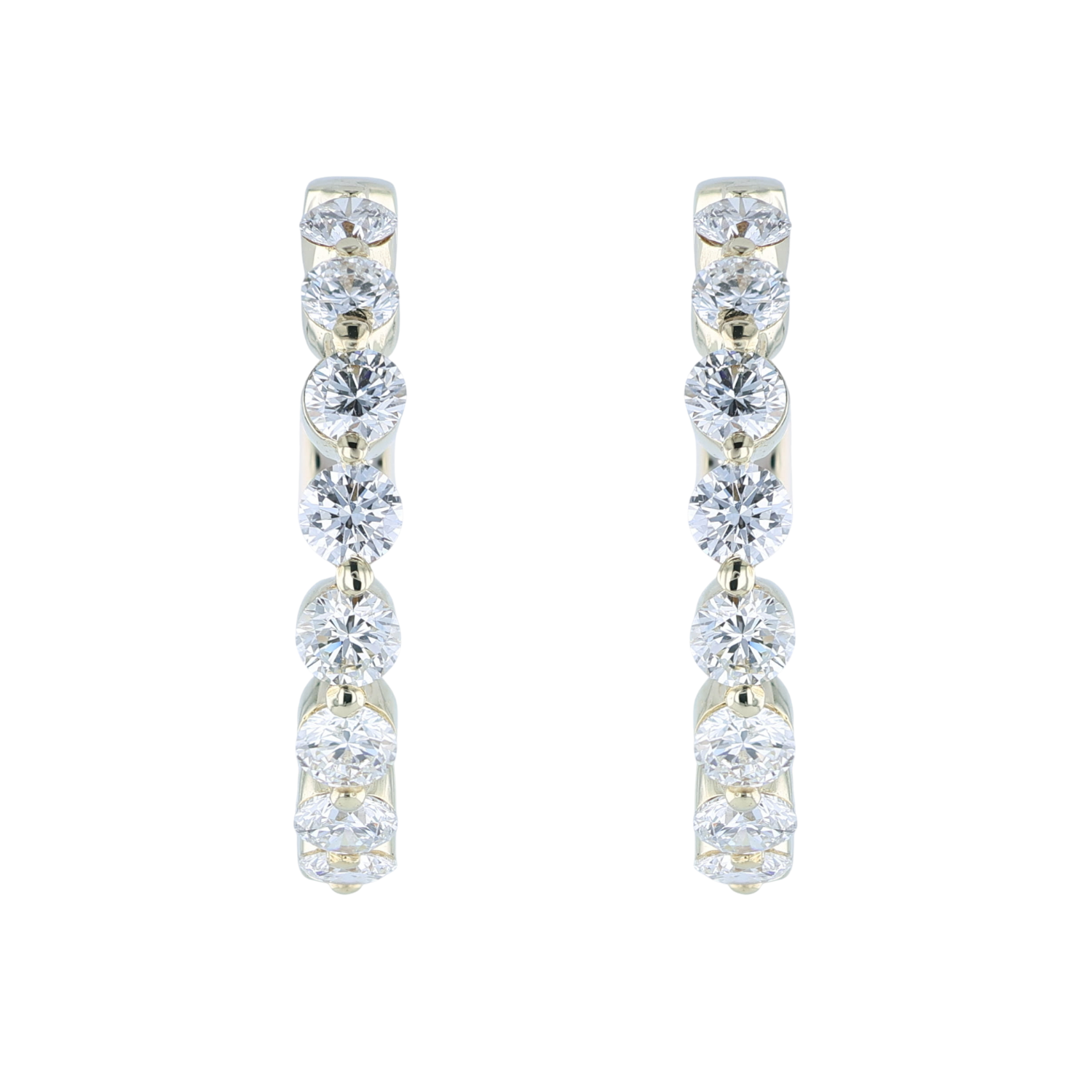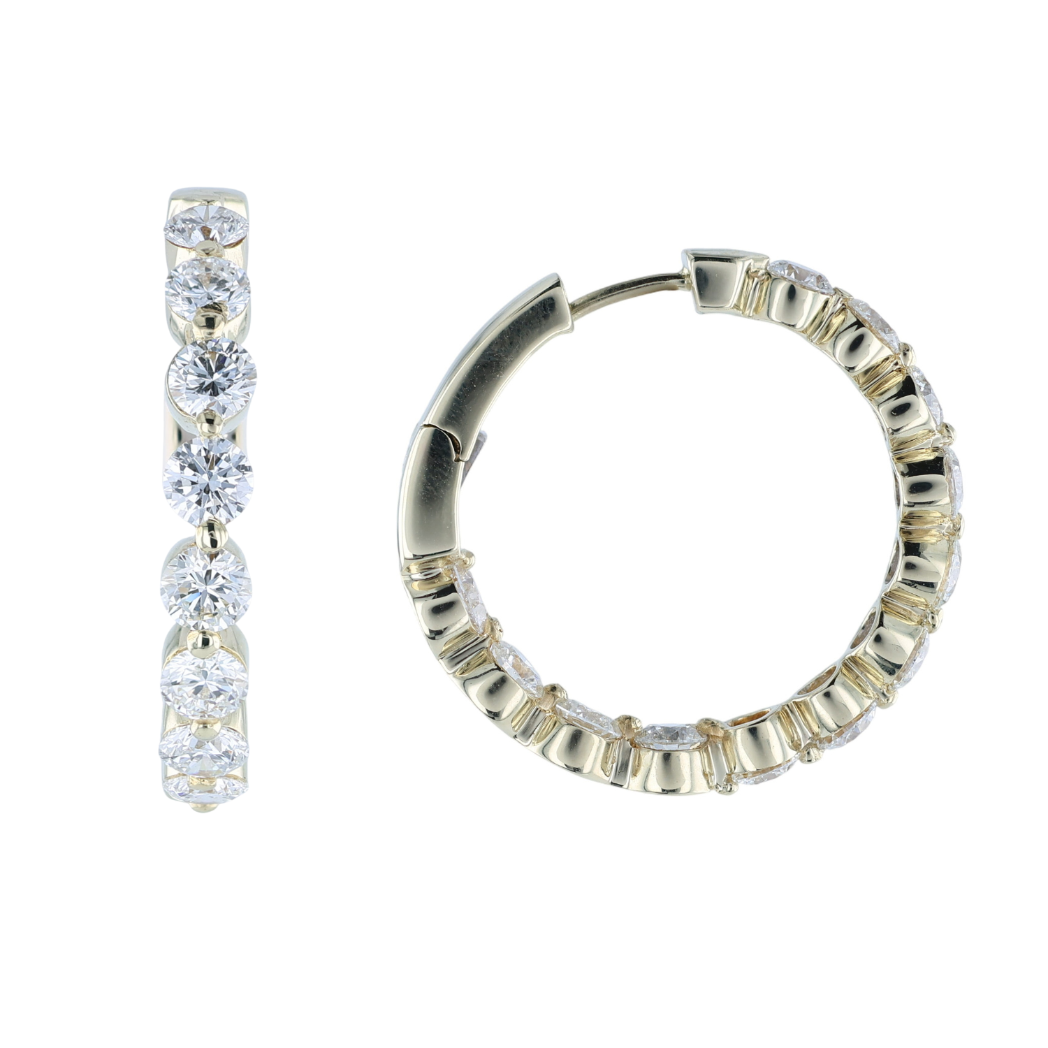From the Bella Cosa Jewelers estate collection. This pre-owned pair of diamond hoop earrings feature an inside-out design of 5.85 carats of diamonds that are I to J in color and SI1 to SI2 in clarity. This pair of diamond inside-out hoop earrings have been set in 14K yellow gold.