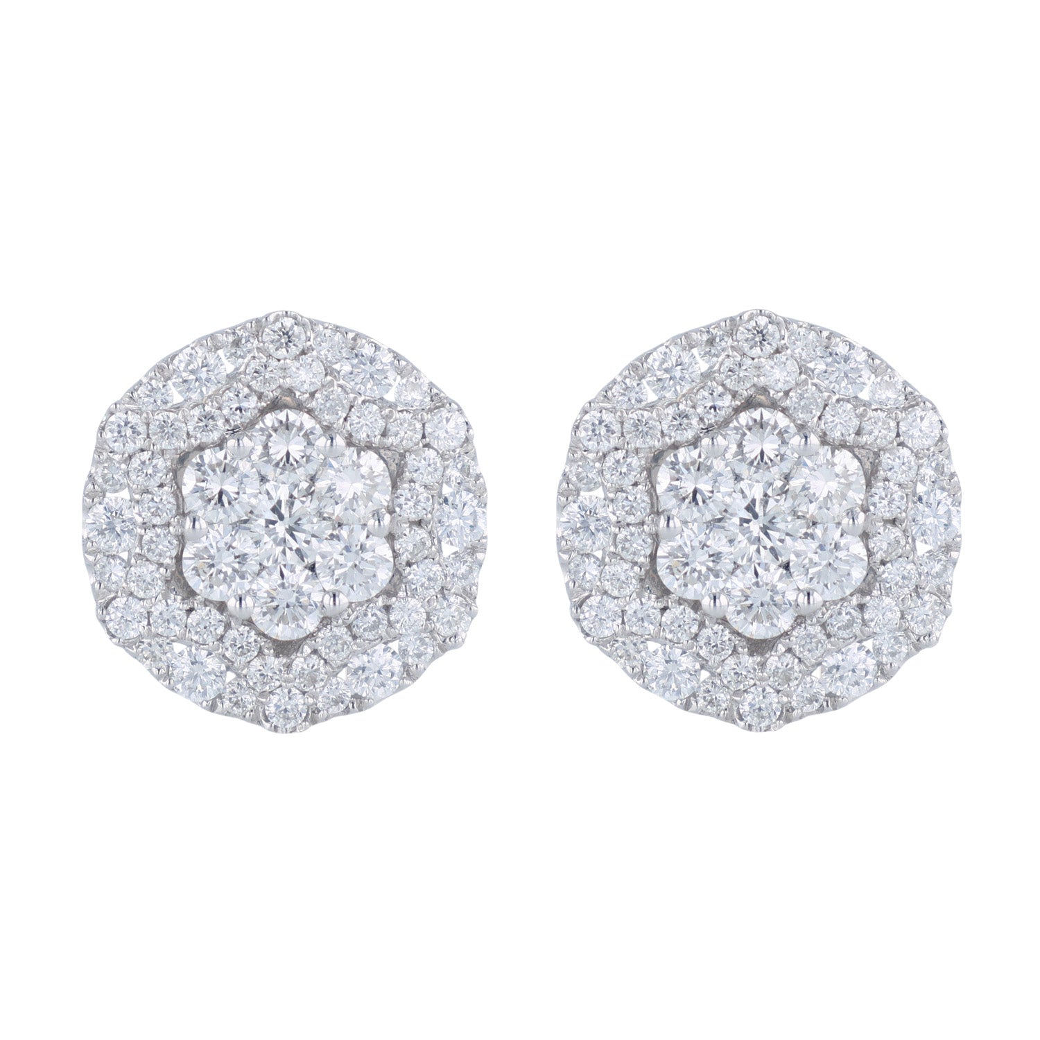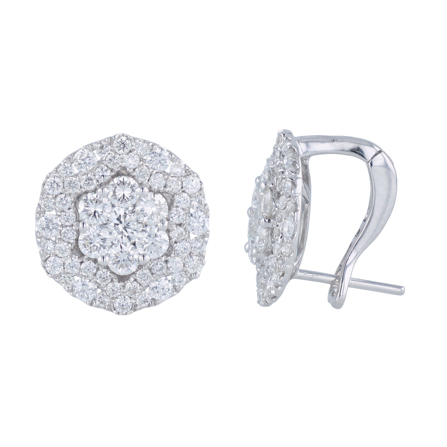 From the Bella Cosa Jewelers estate collection. This pre-owned pair of diamond earrings feature 2.20 carats of diamonds that are F to G in color and VS1 to VS2 in clarity. This pair of diamond earrings have been set in 18K white gold and have an Omega back closure.