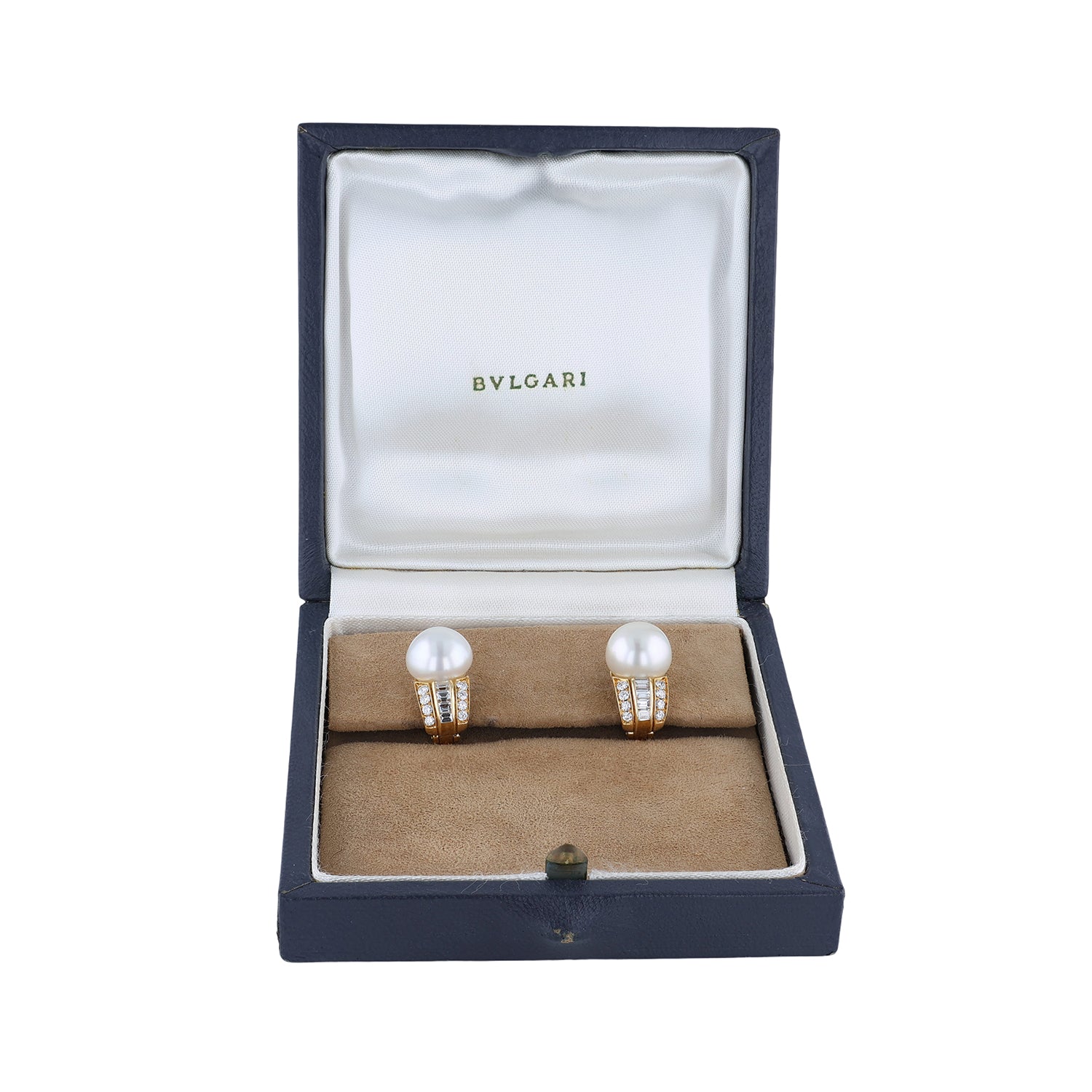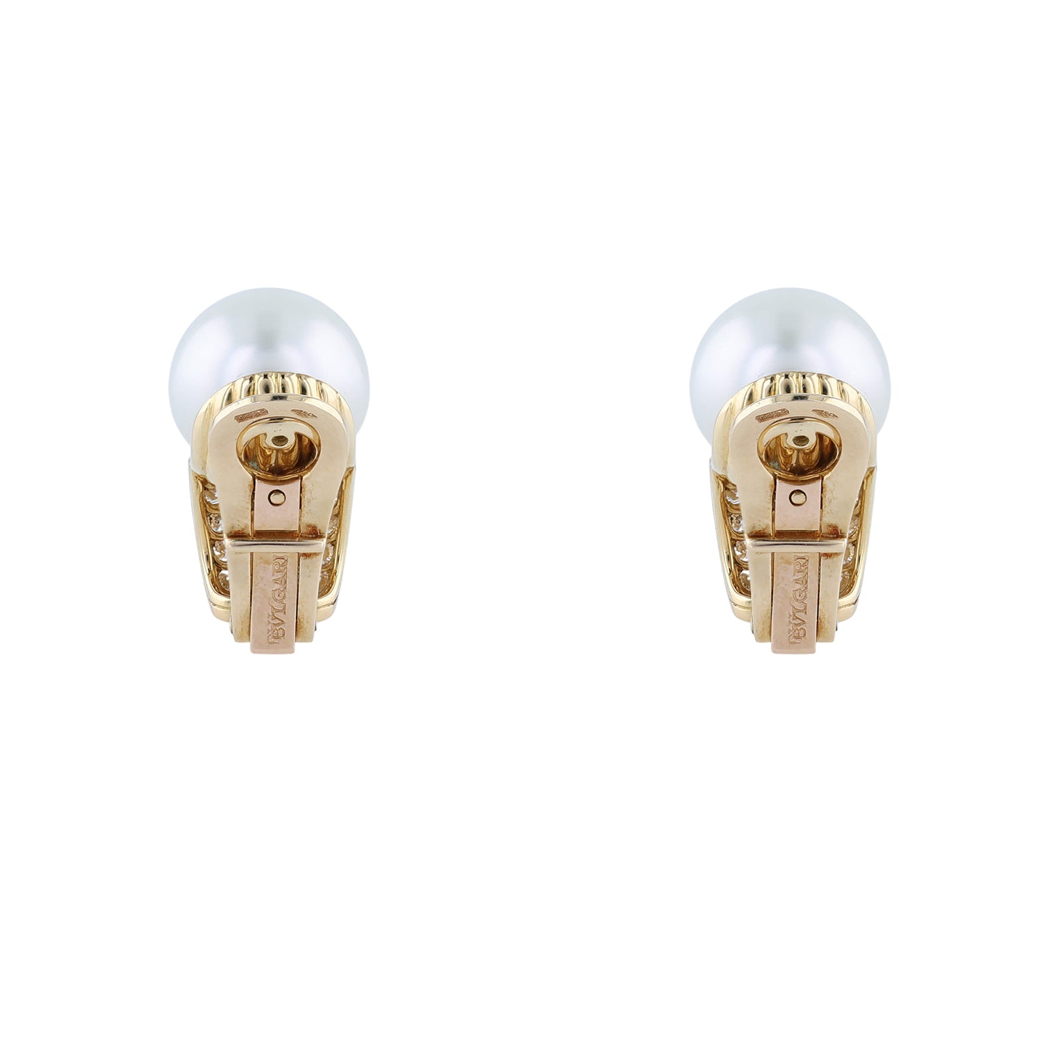 From the Bella Cosa Jewelers estate collection. This pre-owned pair of Bvlgari earrings feature pearls that measure 10.7-10.8mm and 0.80 carats of diamonds that are F to G in color and VS1 to VS2 in clarity. This pair of Bvlgari earrings have been set in 18K yellow gold and have a clip-on closure. Includes Box. Diamond weights are estimated.