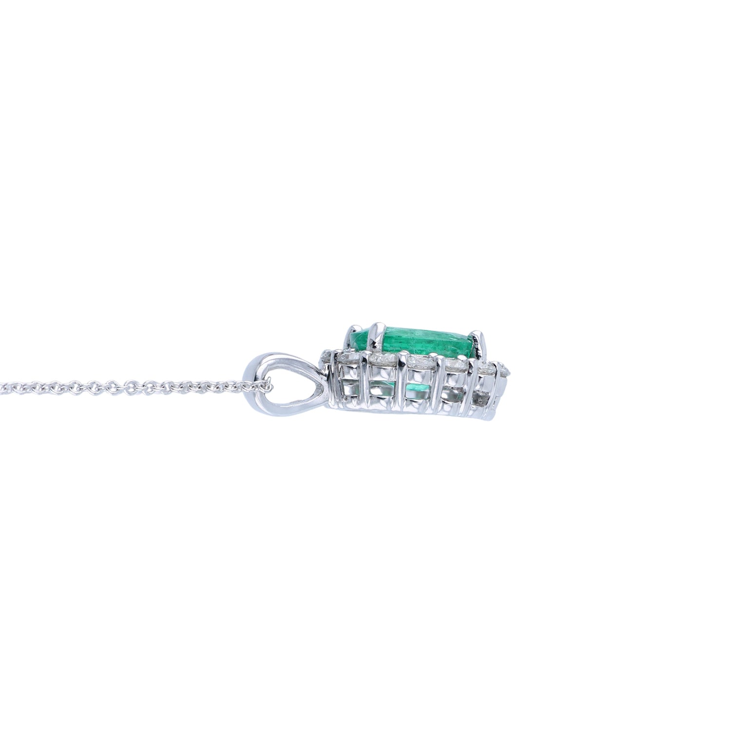 From the Bella Cosa Jewelers estate collection. This emerald and diamond pendant has been set in 14K white gold. This sparkling pendant features a 1.93 carat emerald that is GIA certified and 0.56 carats of diamonds that are H to I in color and SI2 to I1 in clarity. This diamond and emerald pendant comes with a chain that measures 18 inches in length.