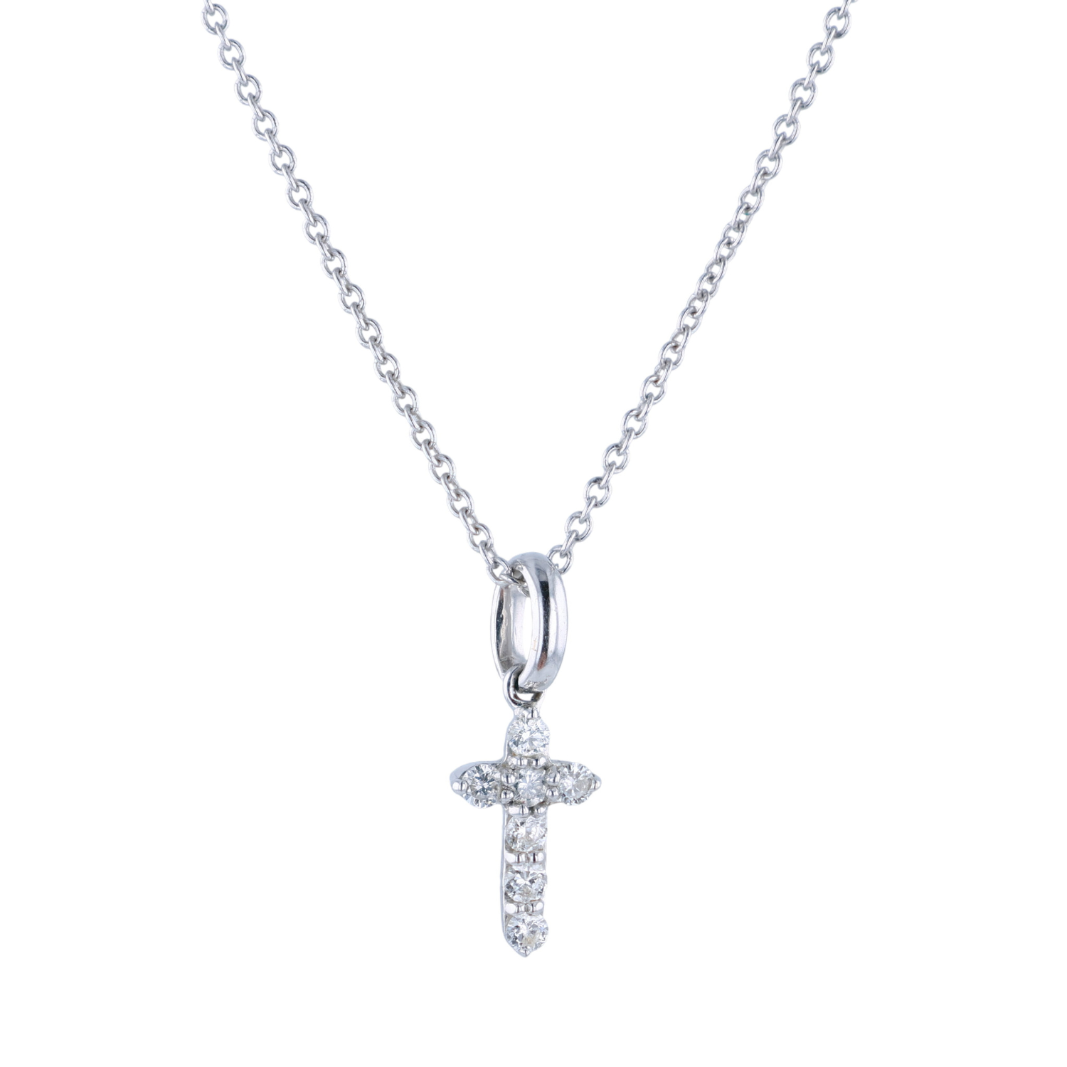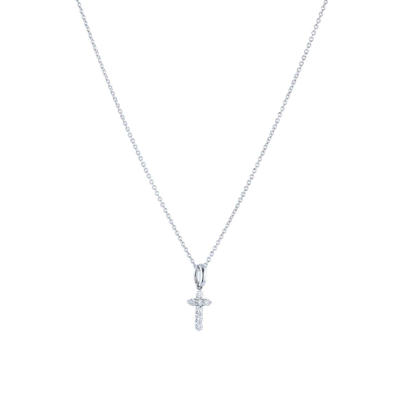 From the Bella Cosa Jewelers estate collection. This pre-owned Clyde Duneier diamond cross pendant has been set in 18K white gold. This Clyde Duneier cross pendant features 0.14 carats of diamonds that are G to H in color and I1 to I2 in clarity. This Clyde Duneier diamond cross pendant comes with a chain that measures 18 inches in length.