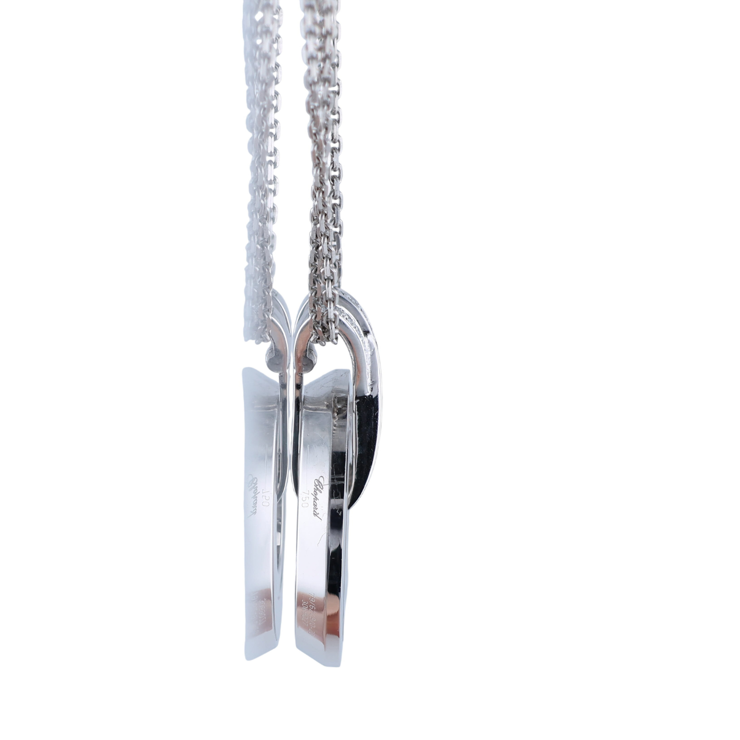 From the Bella Cosa Jewelers estate collection. This pre-owned Chopard diamond necklace is part of the Happy Diamonds collection. This Chopard necklace features 0.47 carats of diamonds that are E to F in color and VVS2 to VS1 in clarity. This Chopard diamond necklace has been set in 18K white gold and measures 16 inches in length. Diamond weights are estimated.