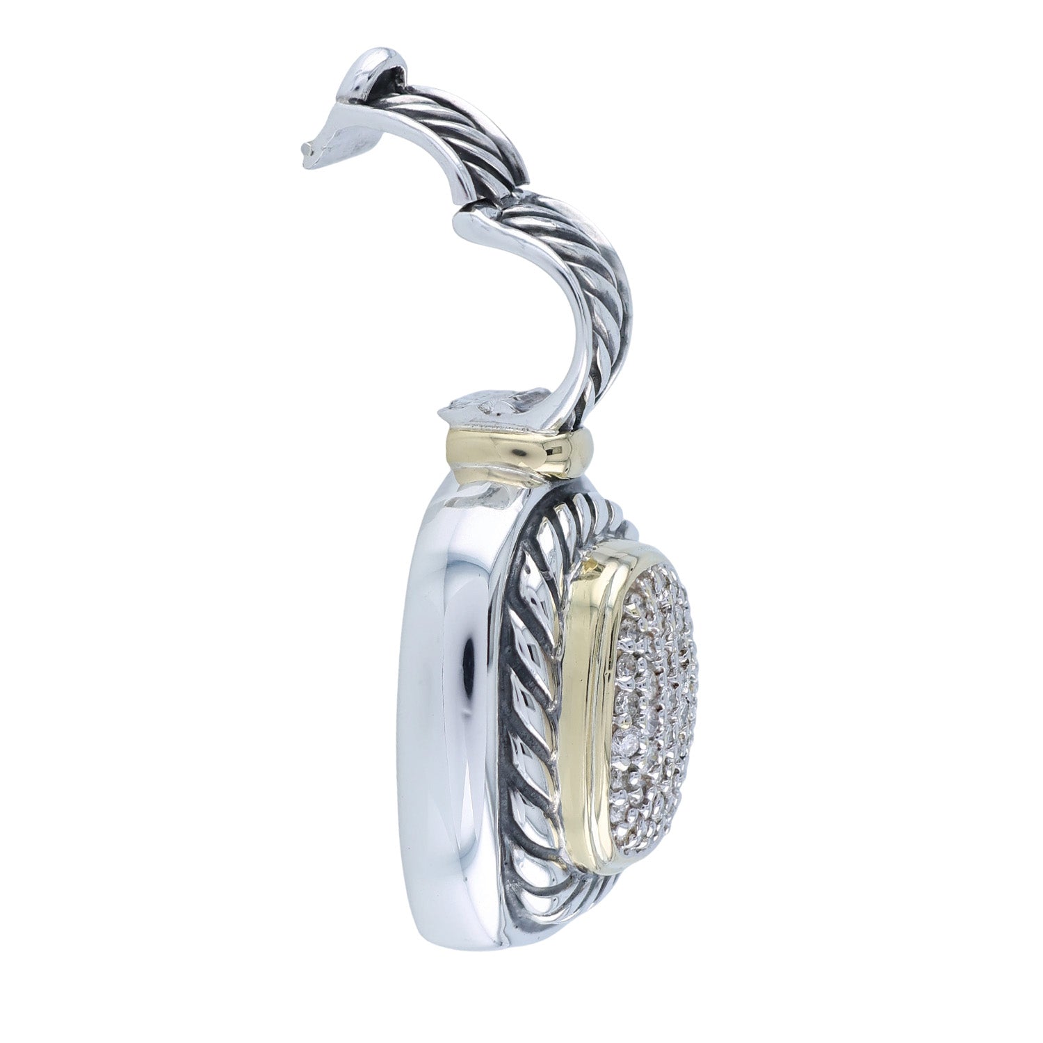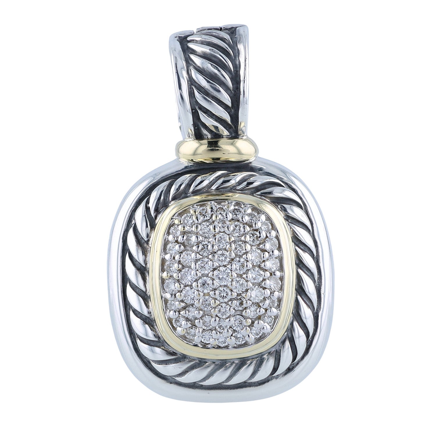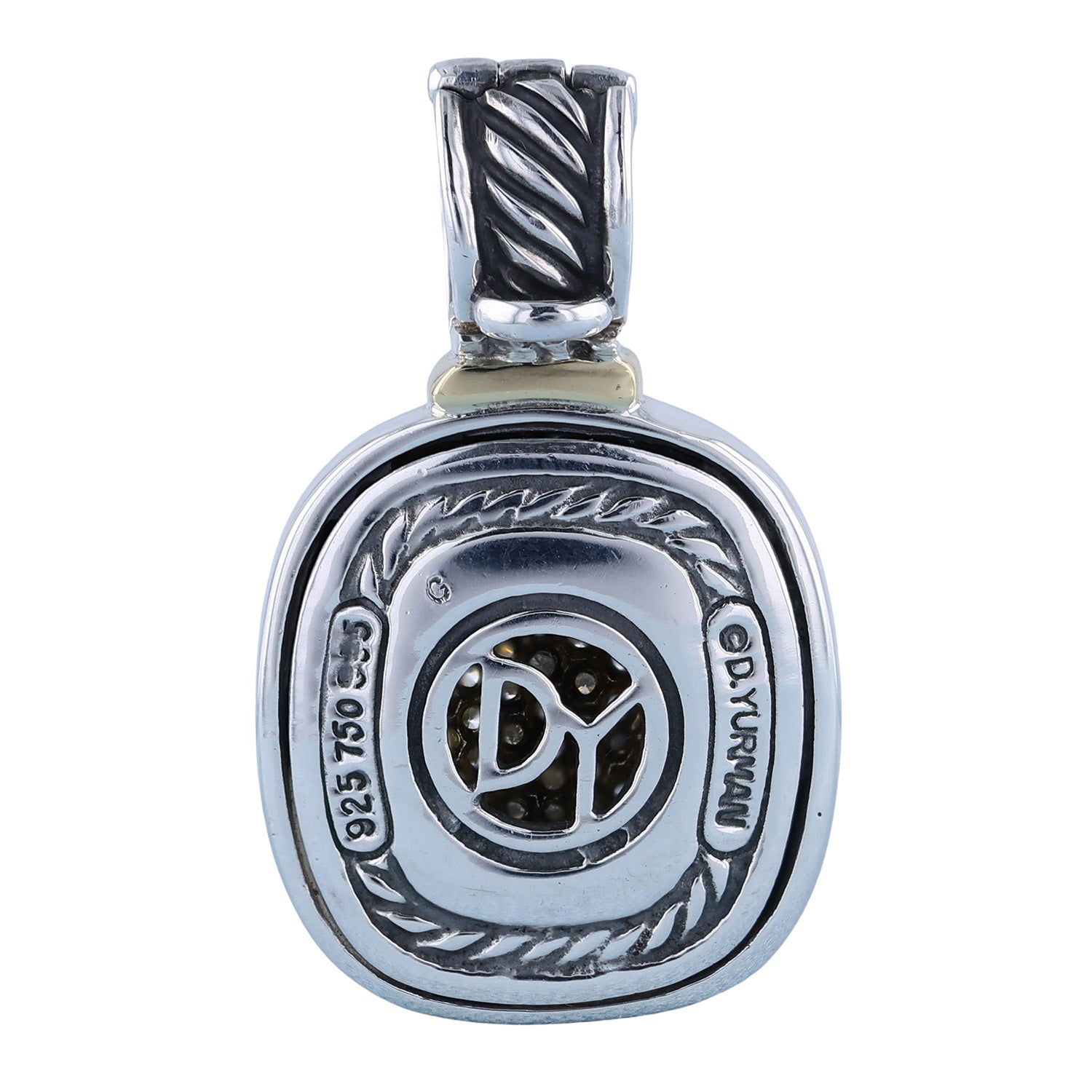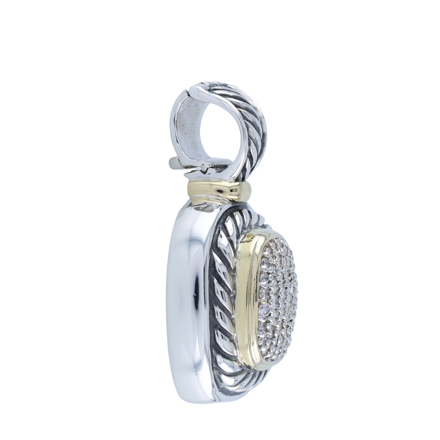 From the Bella Cosa Jewelers estate collection. This pre-owned David Yurman Albion enhancer pendant has been set in sterling silver and 18K yellow gold. This David Yurman enhancer pendant features 0.50 carats of diamonds that are H to I in color VS2 to SI1 in clarity. Diamond weights are estimated.