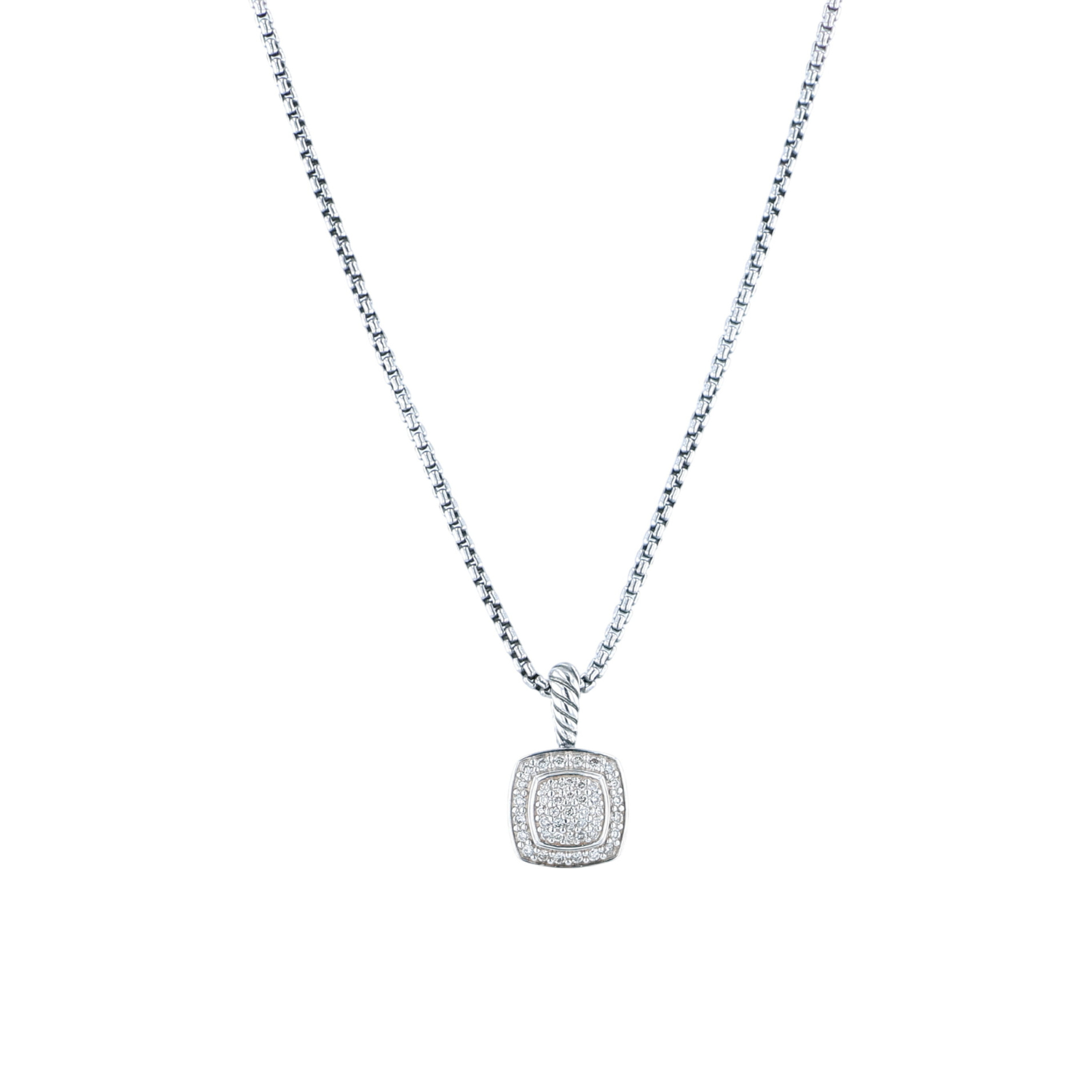From the Bella Cosa Jewelers estate collection. This pre-owned David Yurman Petite Albion diamond pendant has been set in sterling silver. This David Yurman pendant features 0.32 carats of diamonds that are K to L in color and VS2 to SI1 in clarity. This David Yurman pendant comes with a chain that measures 17.25 inches in length. This David Yurman diamond pendant originally retails for $1100. Gemstone weights are estimated.