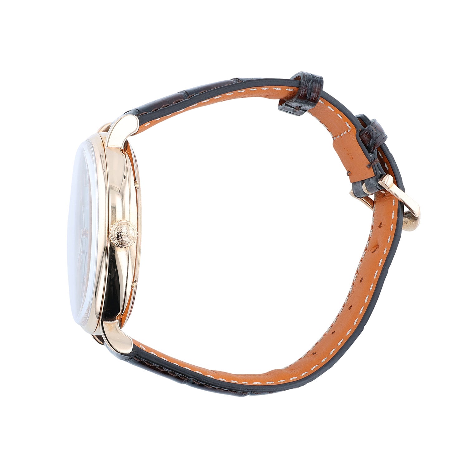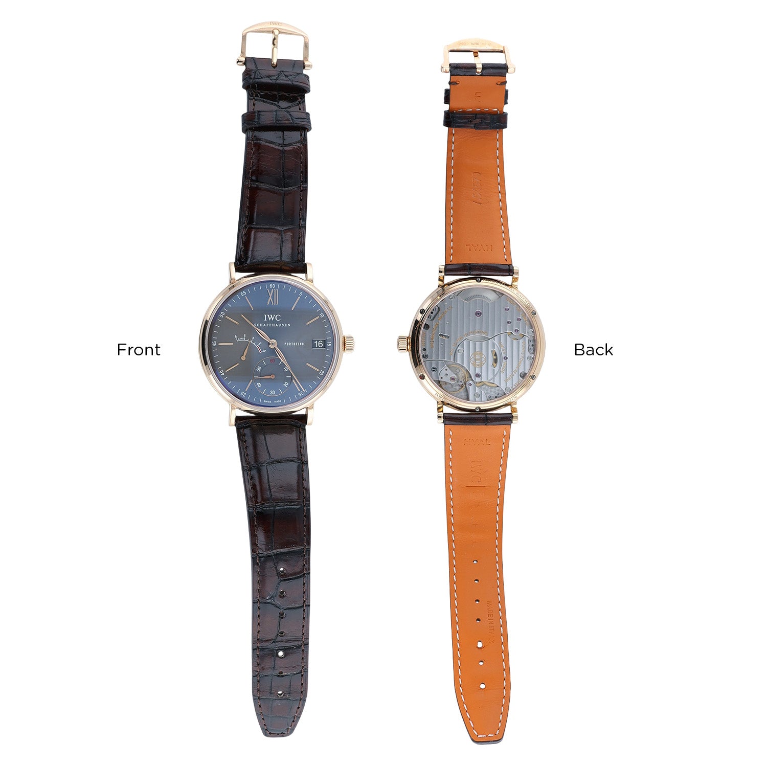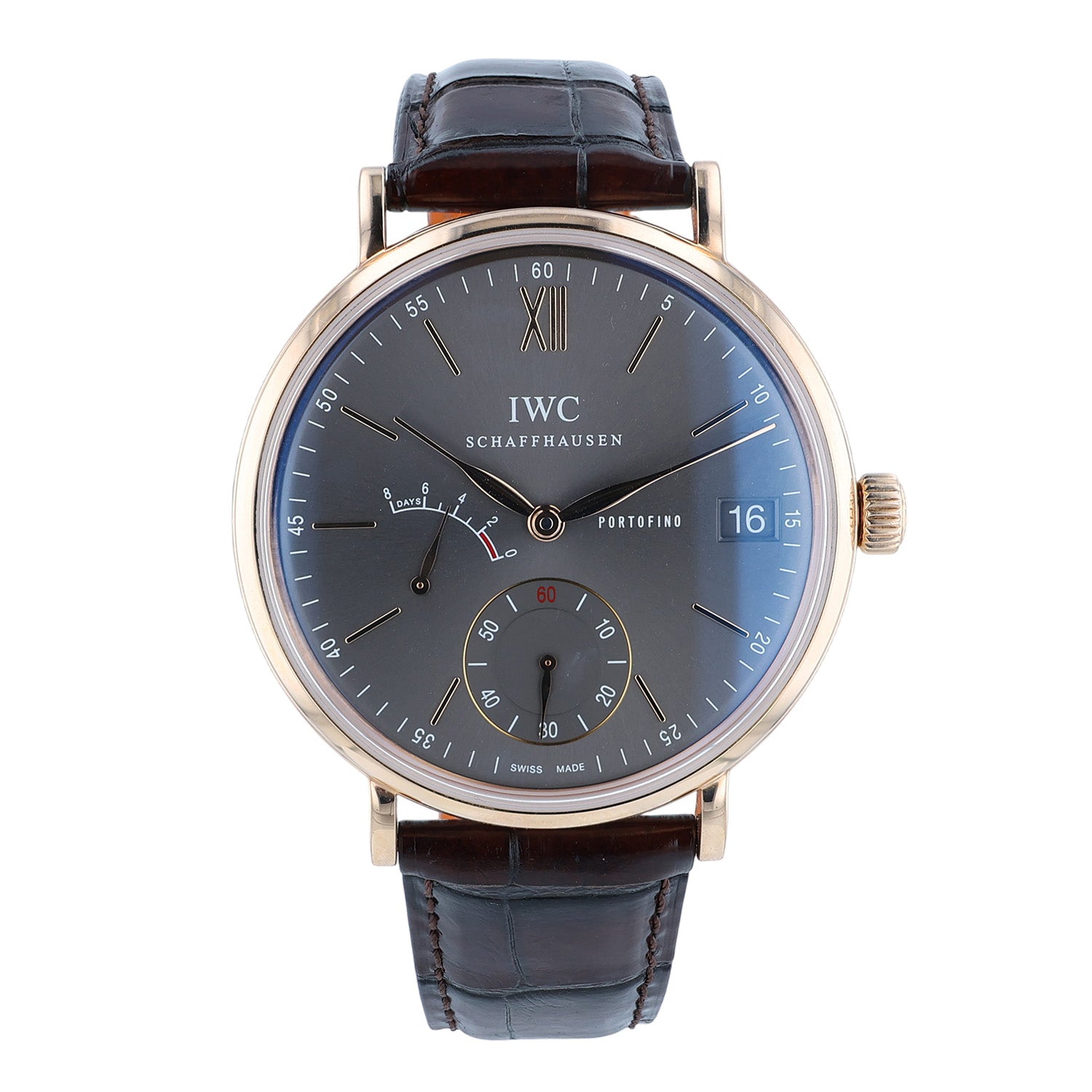 Elegant and refined, this 45 mm IWC Portofino features an 18 k red-gold case, scratch-resistant sapphire crystal, and a slate-grey dial with date, small seconds, and power-reserve indicator. Powered by the in-house manual-wind calibre 59210, it delivers an exceptional 8-day (192 hour) power reserve. Completed with a brown alligator leather strap and sapphire exhibition case back, it offers water resistance to 30 meters/100 feet. Perfect for everyday elegance and occasional splashes.