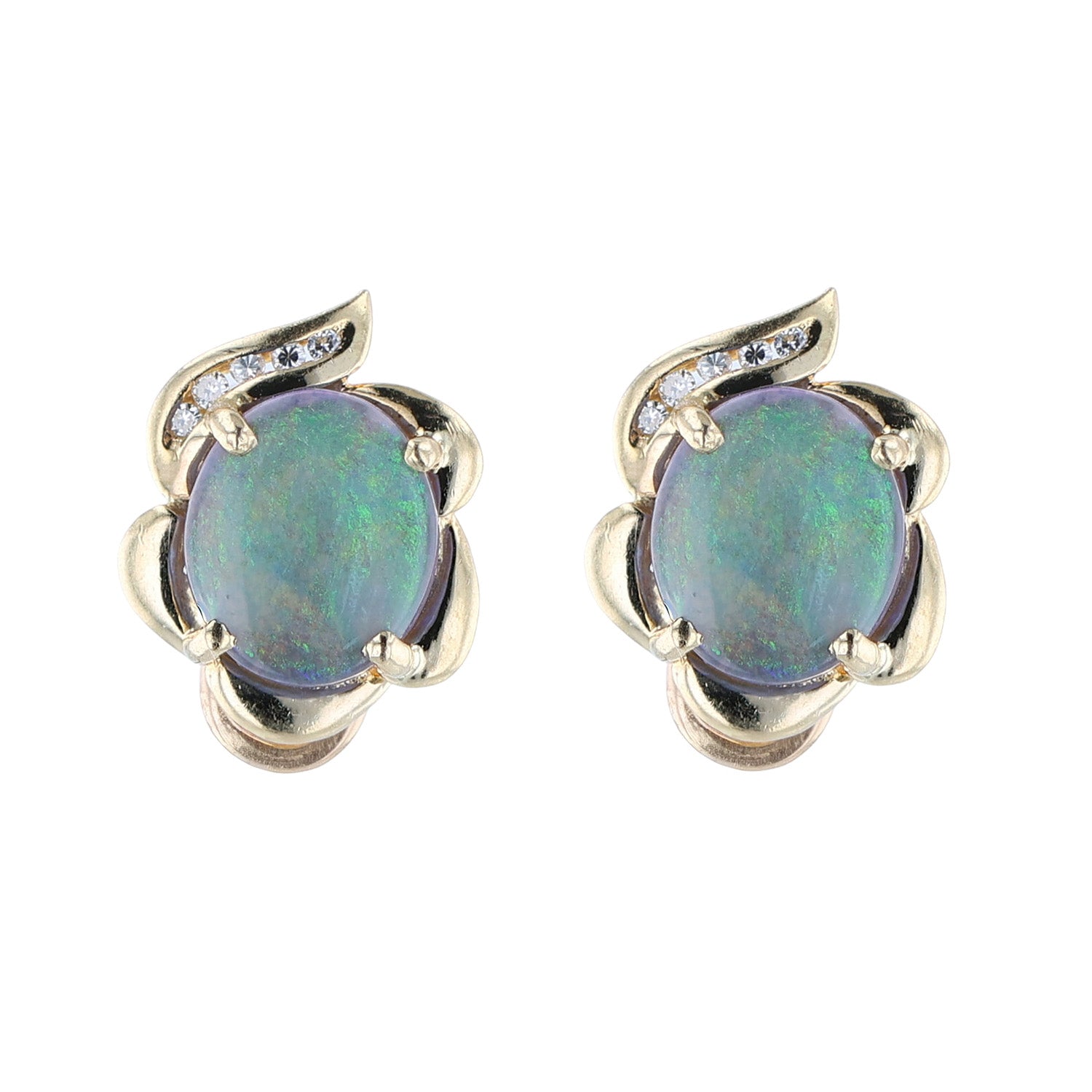 From the Bella Cosa Jewelers estate collection. This pre-owned pair of black opal and diamond earrings have been set in 14K yellow gold and have a clip-on earring closure. This pair of opal and diamond clip-on earrings feature 0.06 carats of diamonds that are G to H in color and VS2 to SI1 in clarity.