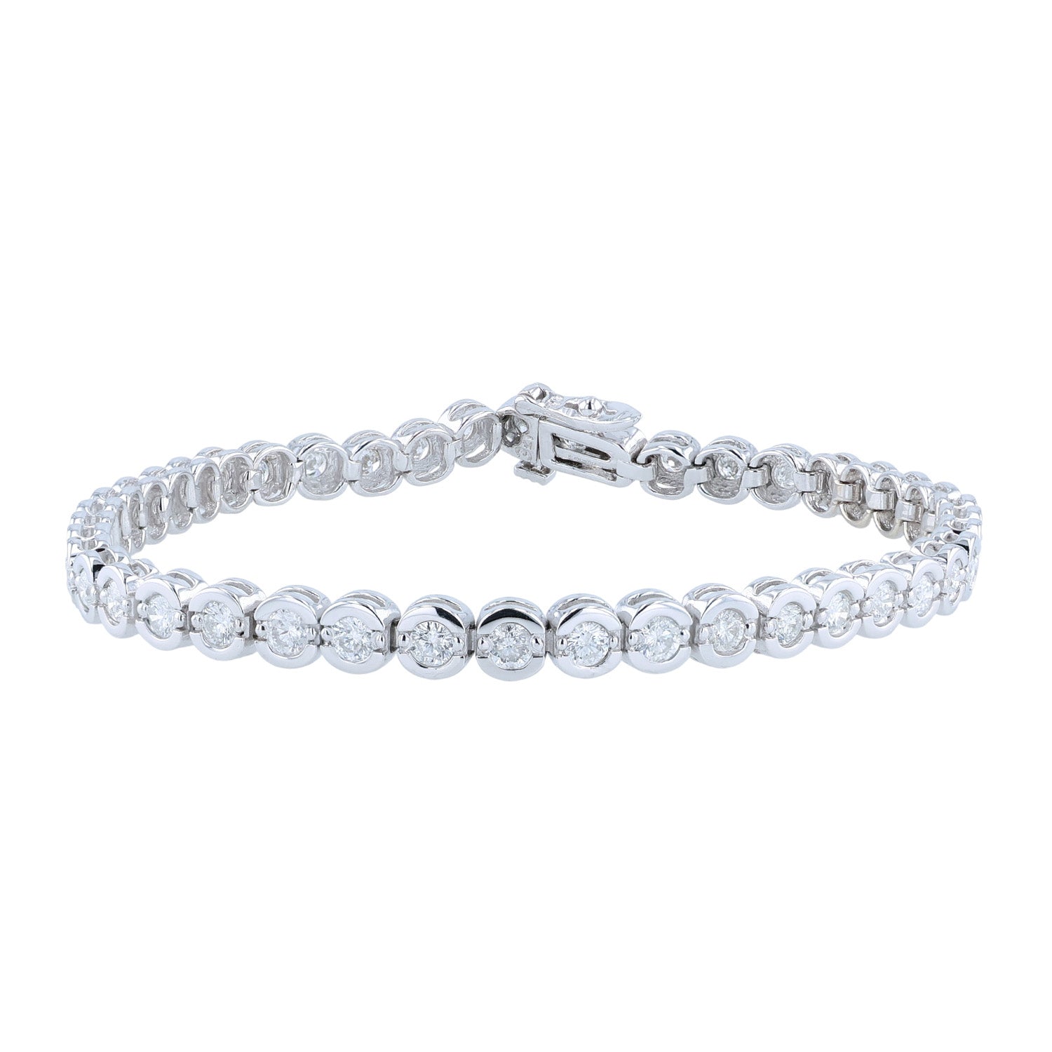 From the Bella Cosa Jewelers estate collection. This pre-owned diamond bracelet features 3.08 carats of diamonds that are F to G in color and I1 to I2 in clarity that have been set in 14K white gold. This diamond tennis bracelet measures 7.25 inches in length. Diamond weights are estimated.