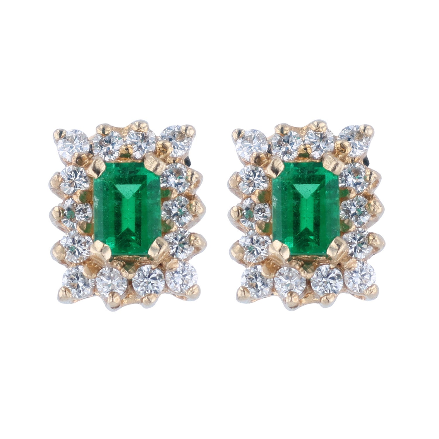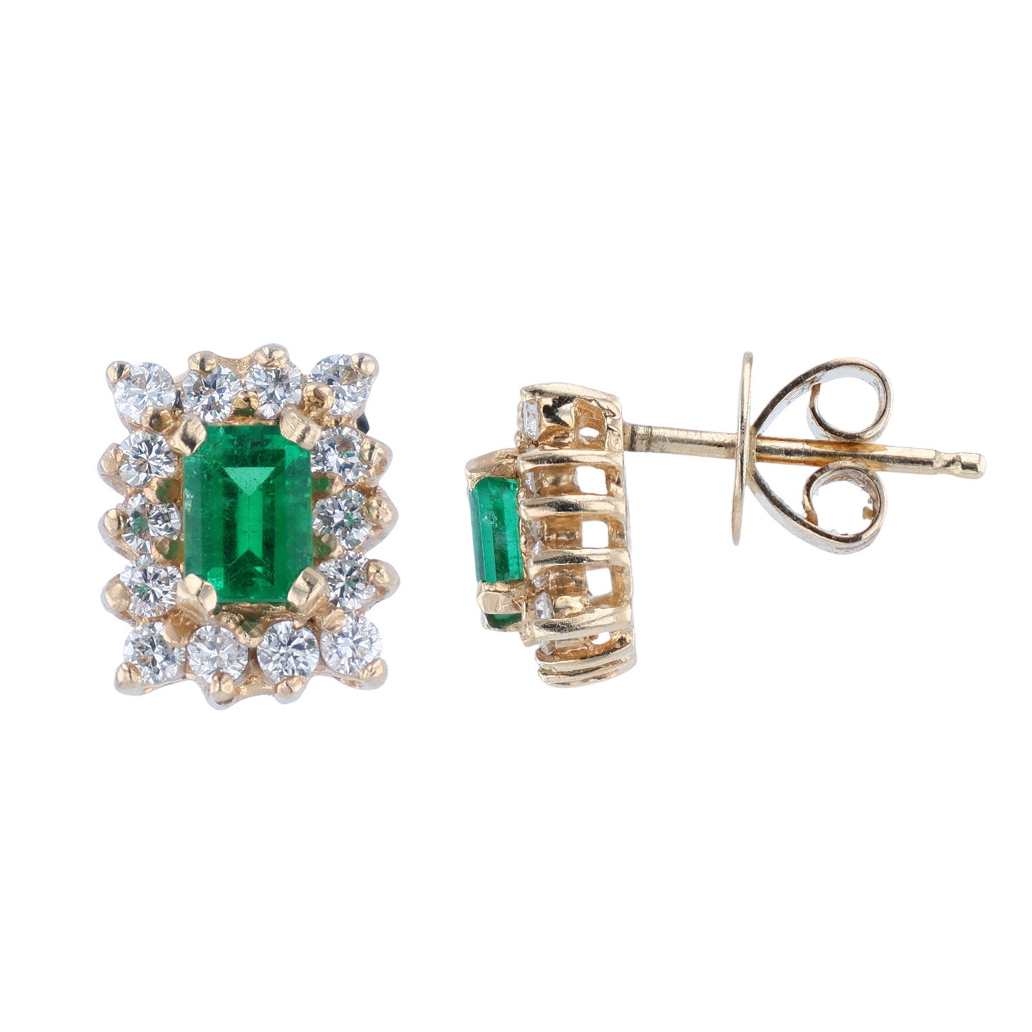 From the Bella Cosa Jewelers estate collection. This pre-owned pair of emerald and diamond earrings have been set in 14K yellow gold. This pair of earrings feature 0.44 carats of emeralds and 0.42 carats of diamonds that are F to G in color and VS2 to SI1 in clarity. This pair of earrings have a friction back closure.