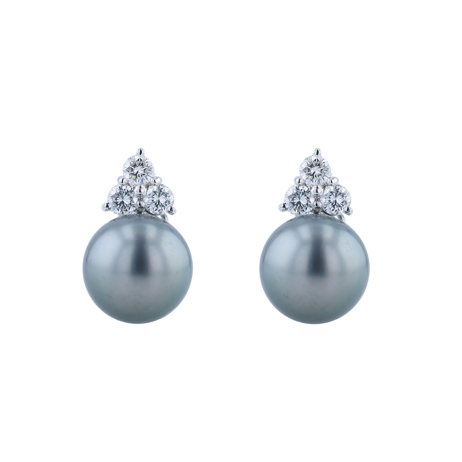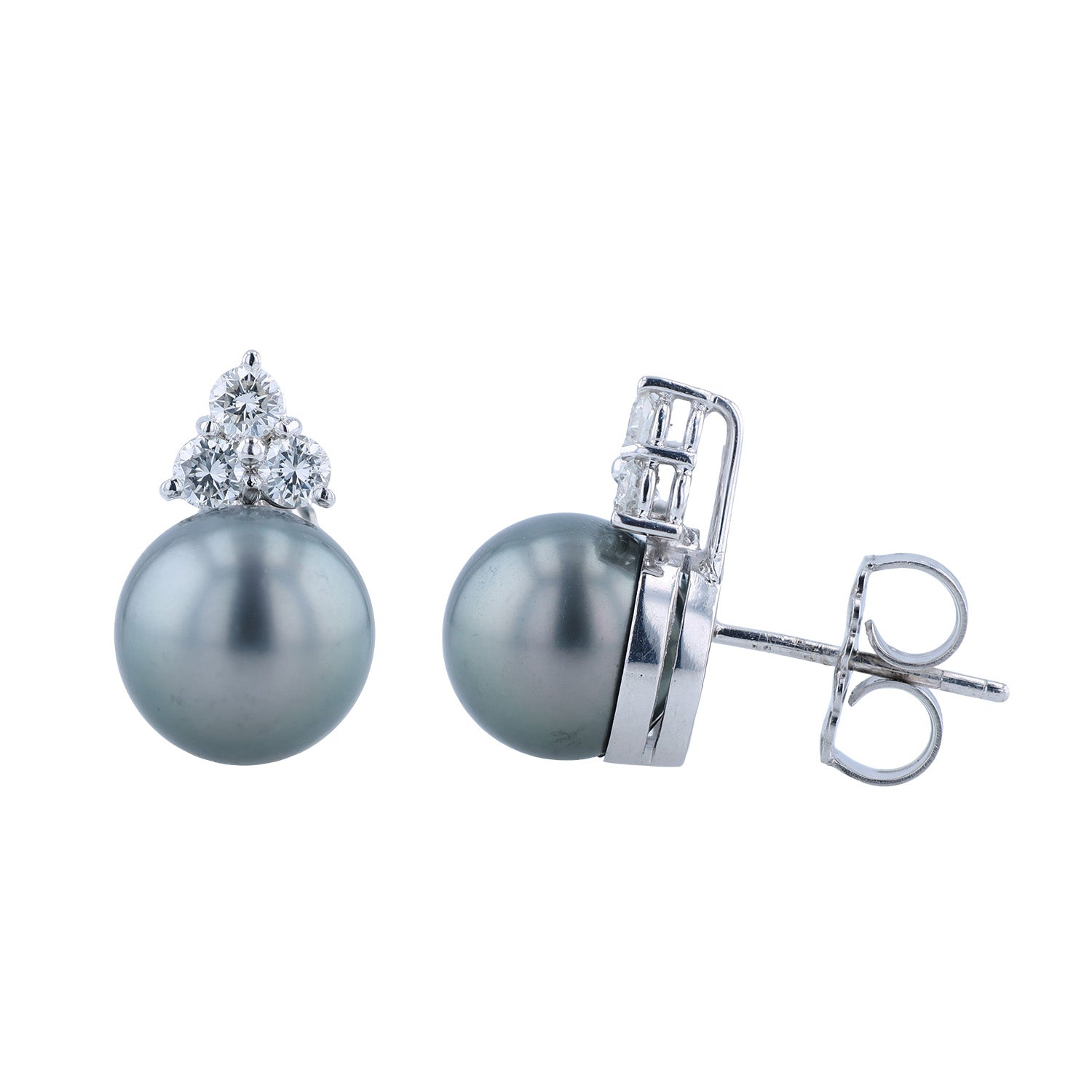 From the Bella Cosa Jewelers estate collection. The Tahitian Black Pearls measure 10.7mm and the total weight of the six round brilliant diamonds is 0.63 carats. The earrings are pierced. Diamond weights are estimated.