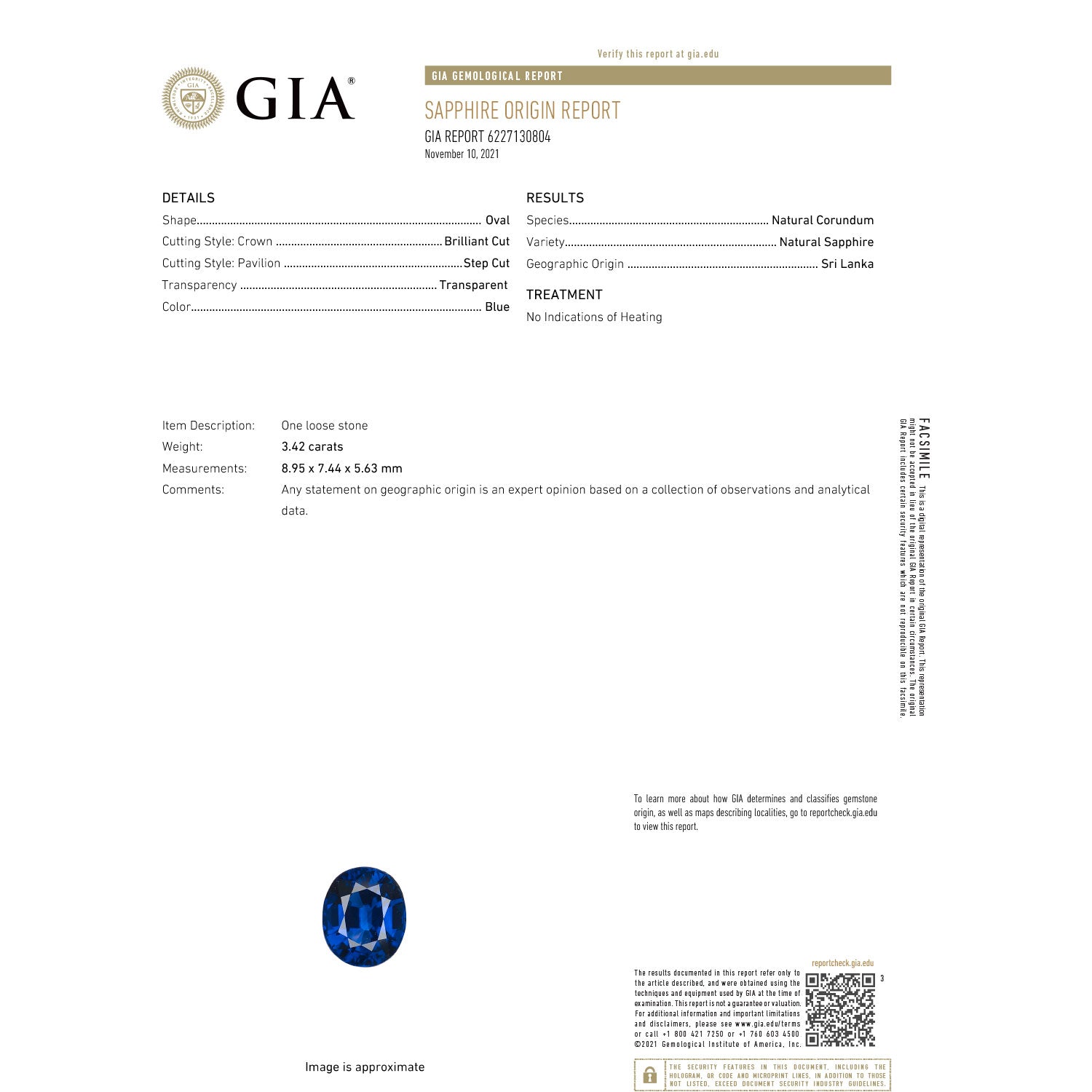 This ring features one natural, blue, no-heat sapphire framed by two oval brilliant diamonds, set in platinum. The sapphire weighs 3.42 carats and has been graded by the GIA with report number 6227130804; the colorless diamonds have a total weight of 0.65 carats. The sapphire has no indication of heat treatment.