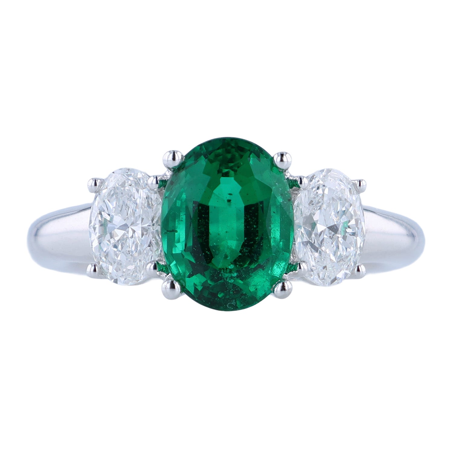From our Spark Creations collection. This stunning emerald and diamond three-stone ring has been set in platinum and is a size 6.5.