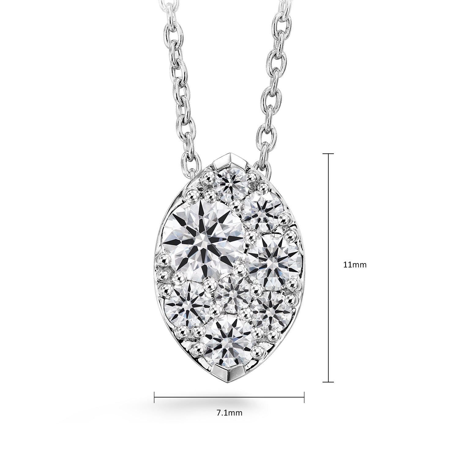 Navette is another term to describe a jewelry contour. Pointed at both ends with equally curved sides. Seamless, irregular pave to create a classic, but unique cluster look. Tapered from top to bottom to enhance the appearance of pure sparkle from the top view and help the pendant lay flush against the skin. Beautifully honey-combed back plating, mirrored inside and out for more luxurious finishing details.