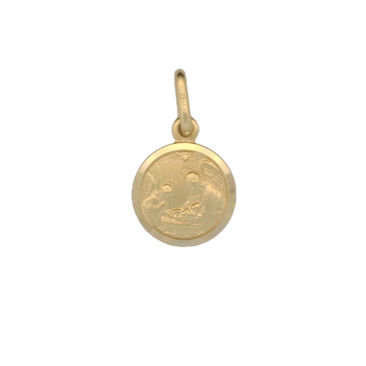 This solid gold miraculous medal is set in 18K yellow gold and is made in Italy. This miraculous medal is coined. The back of this miraculous medal is engraved with ‘Ricordo Del Battesimo’ in Italian which translates to ‘Memory of Baptism’ in English.