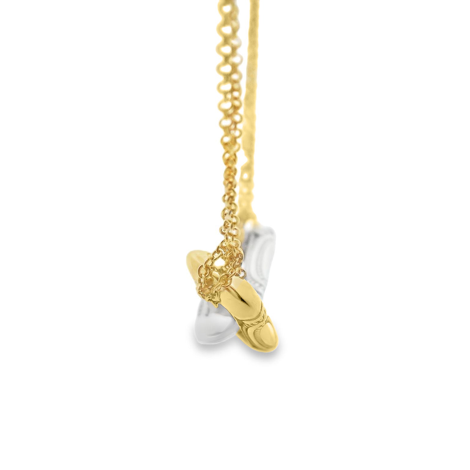 From the TACORI Fine Jewelry Collection, the TACORI 18K Crescent Eclipse Double Link Necklace features a two-tone design in yellow and white gold. It includes a hand-hewn, milgrain-embellished, interconnected link pendant, measuring at 1.1 in x 8.5 mm. The necklace is approximately 17 inches in length, with additional jump rings at 15 and 16 inches.