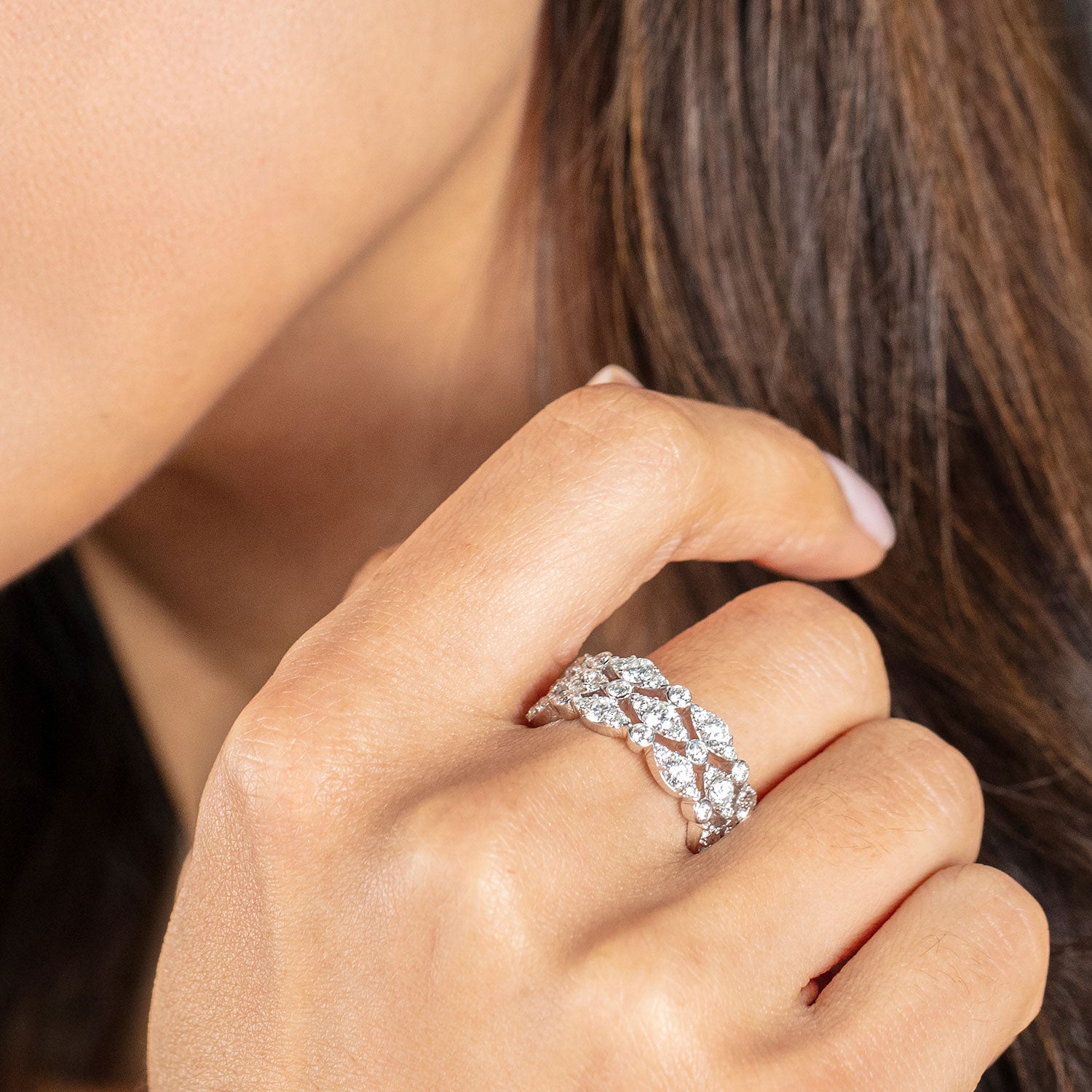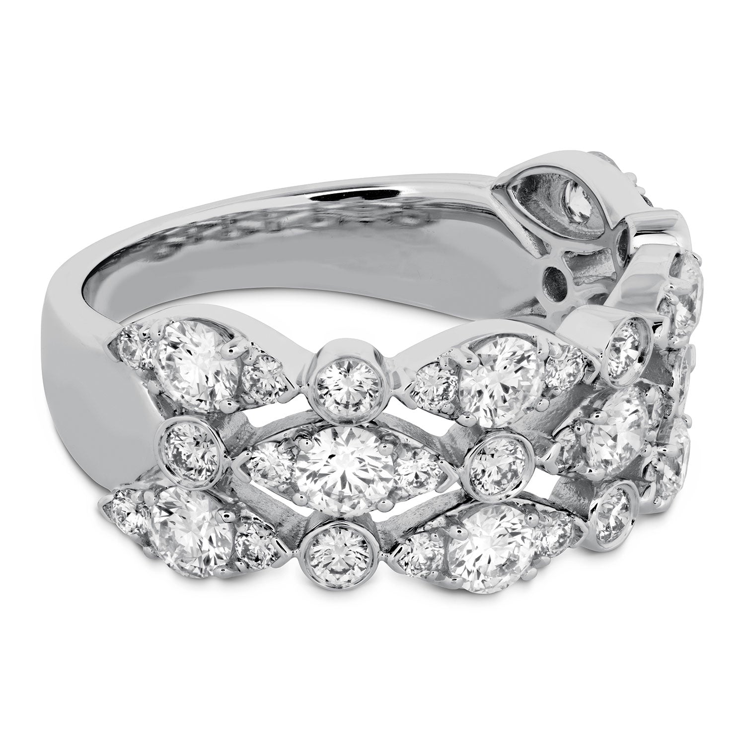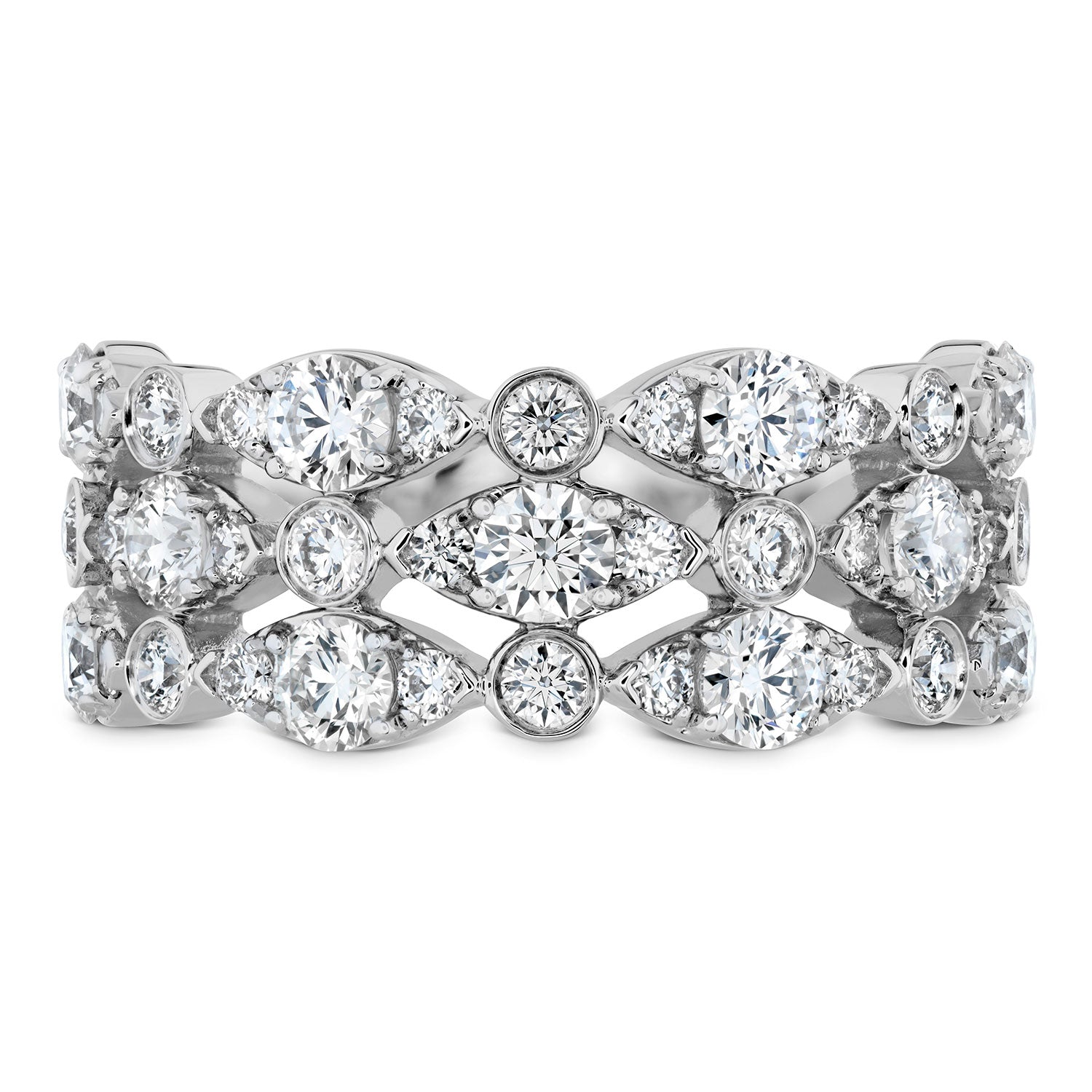 The Bezel Regal Triple Ring is a work of art with its original design. Each of its three bands features diamonds in alternate sizes and settings to create a beautiful piece you will wear forever.