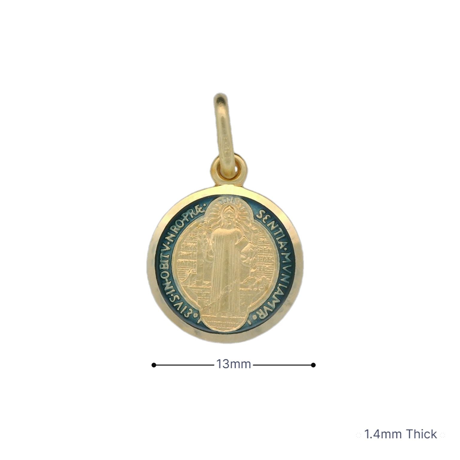 This solid gold miraculous medal is set in 18K yellow gold and is made in Italy. This miraculous medal is coined. This medal features enameling. The front of this medal is engraved with the Latin phrase 'eivs in obitv nro prae sentia mvniamvr' which translates in English to 'May we be strengthened by his presence in the hour of our death.' The back of this medal features the letters C S P B which signify Crux S. Patris Benedicti - which means 'Cross of Holy Father Benedict.'