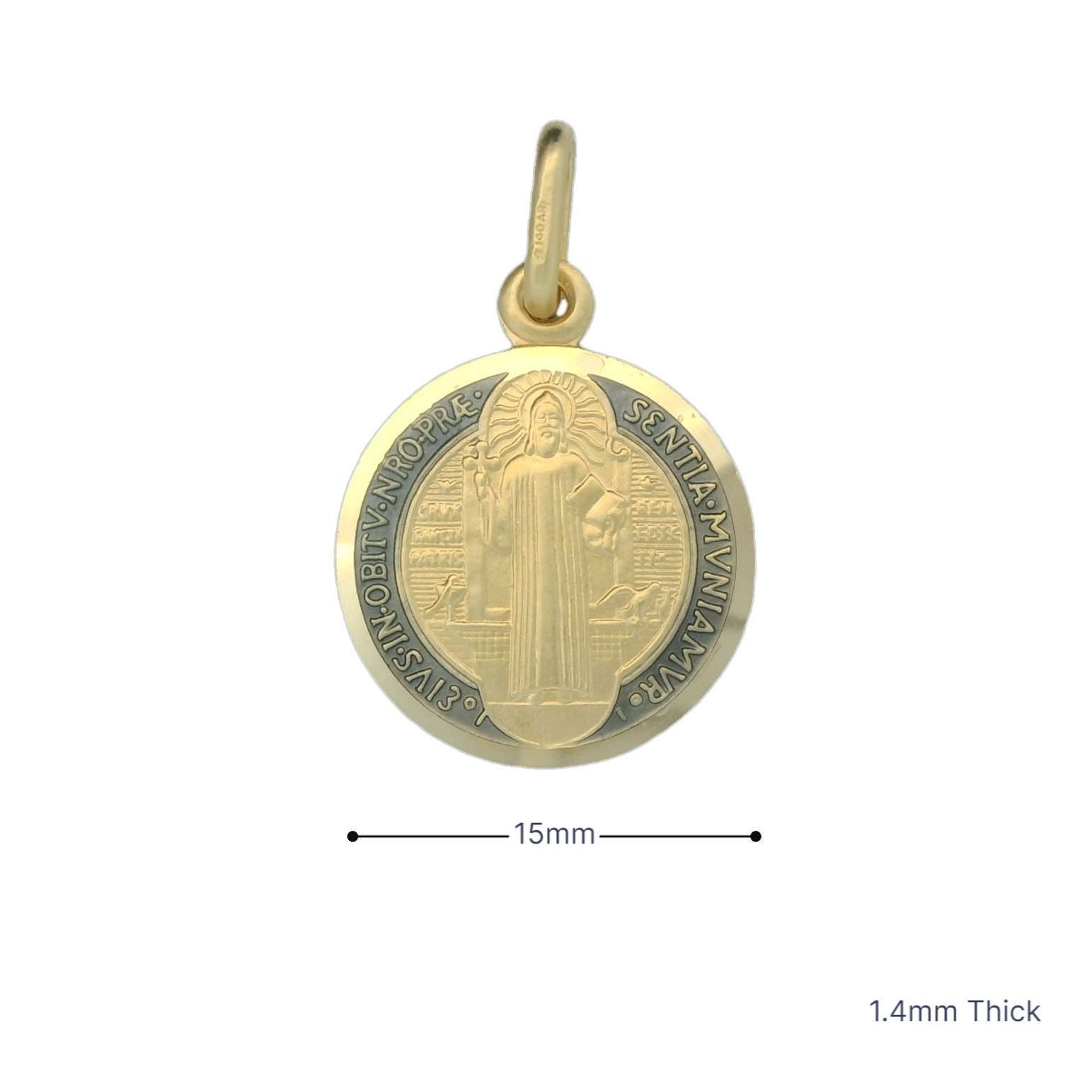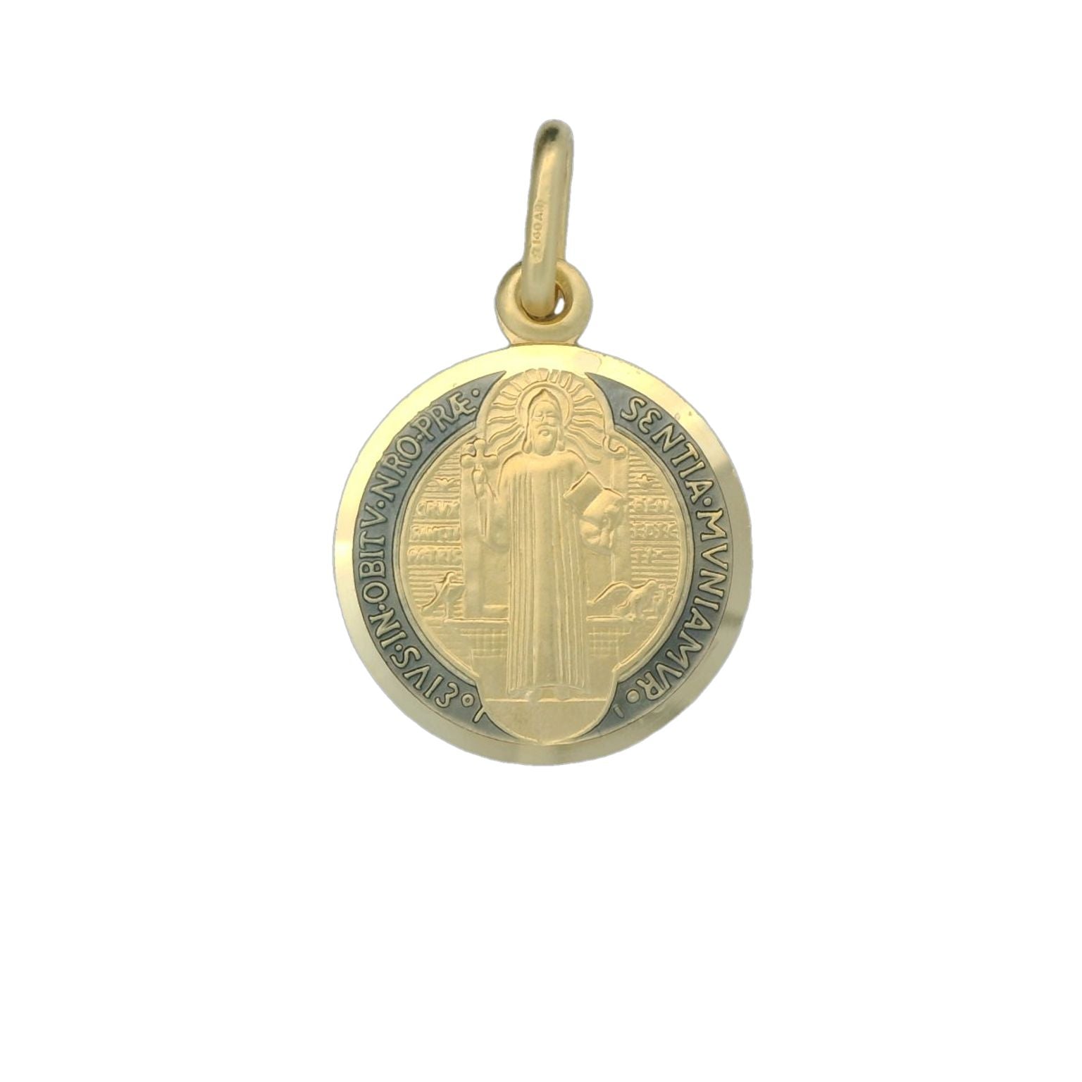 This solid gold miraculous medal is set in 18K yellow gold and is made in Italy. This miraculous medal is coined. This medal features enameling. The front of this medal is engraved with the Latin phrase 'eivs in obitv nro prae sentia mvniamvr' which translates in English to 'May we be strengthened by his presence in the hour of our death.' The back of this medal features the letters C S P B which signify Crux S. Patris Benedicti - which means 'Cross of Holy Father Benedict.'