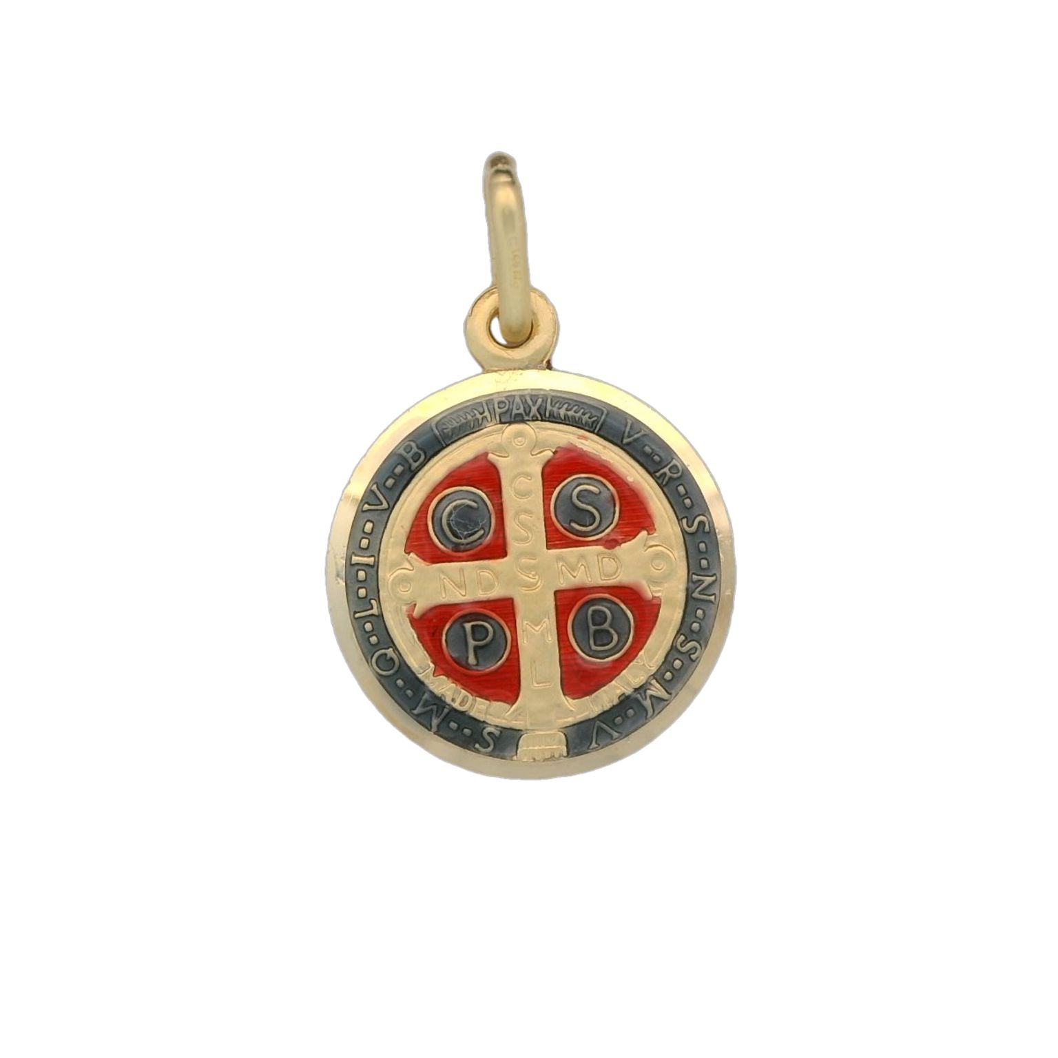 This solid gold miraculous medal is set in 18K yellow gold and is made in Italy. This miraculous medal is coined. This medal features enameling. The front of this medal is engraved with the Latin phrase 'eivs in obitv nro prae sentia mvniamvr' which translates in English to 'May we be strengthened by his presence in the hour of our death.' The back of this medal features the letters C S P B which signify Crux S. Patris Benedicti - which means 'Cross of Holy Father Benedict.'