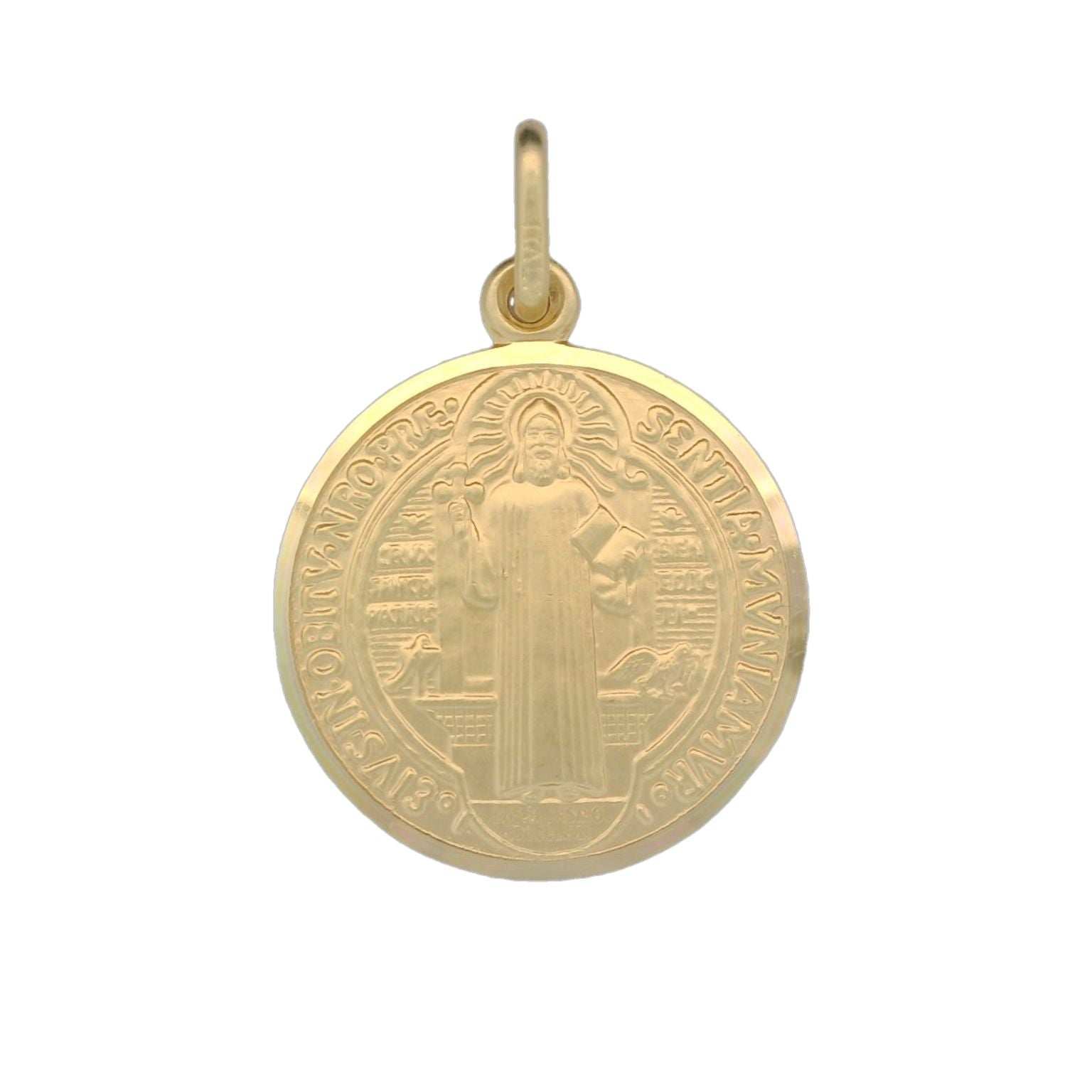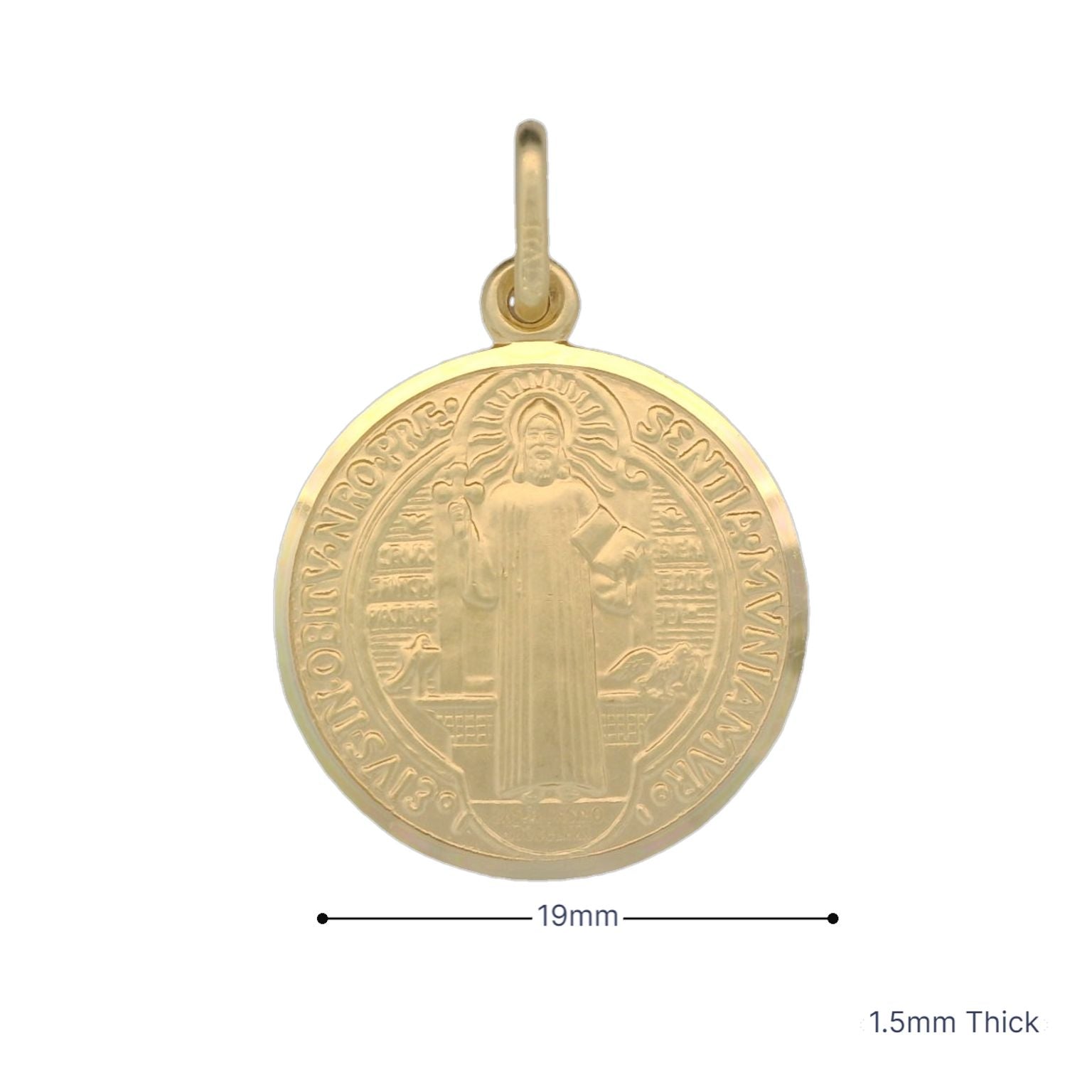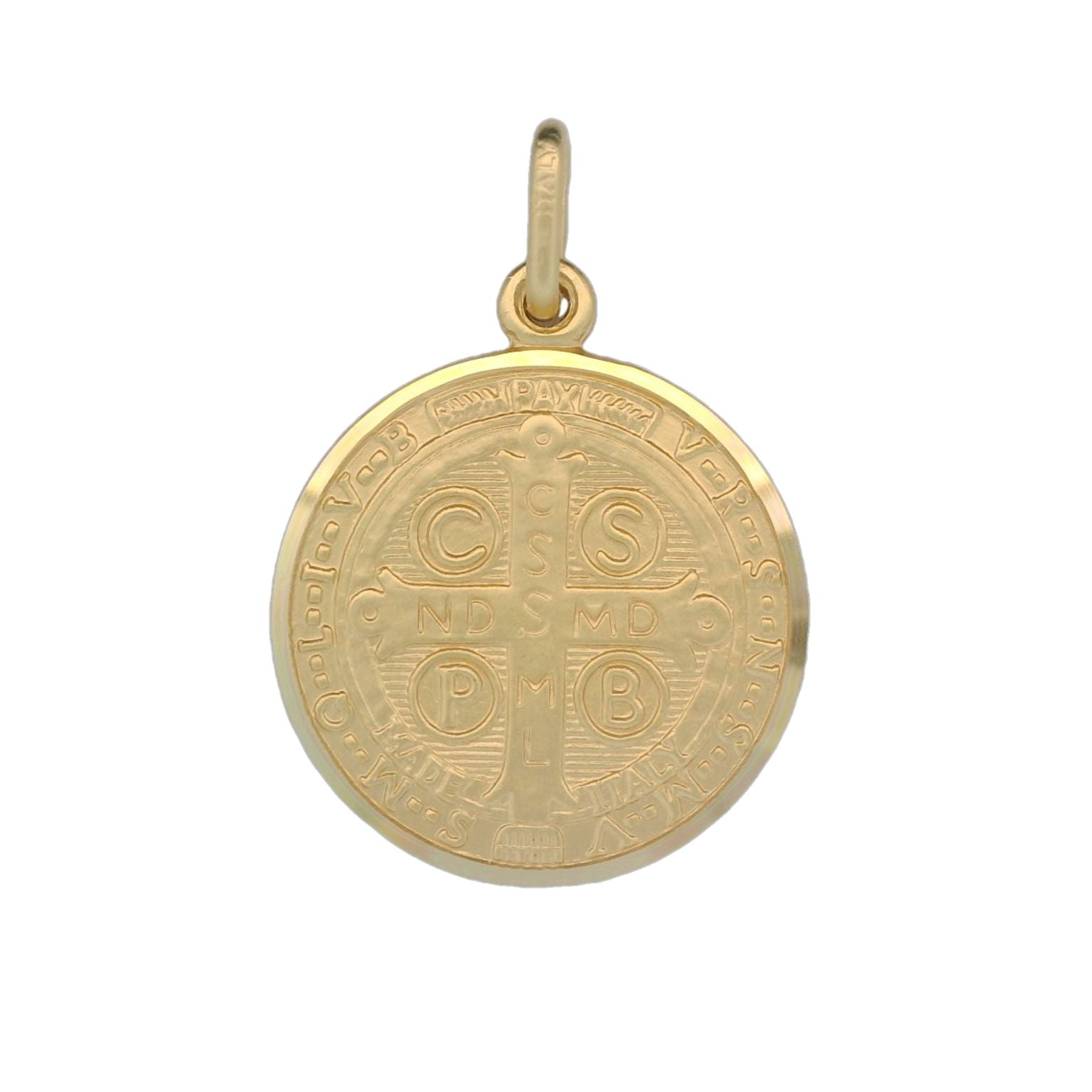 This solid gold miraculous medal is set in 18K yellow gold and is made in Italy. This miraculous medal is coined. The front of this medal is engraved with the Latin phrase 'eivs in obitv nro prae sentia mvniamvr' which translates in English to 'May we be strengthened by his presence in the hour of our death.' The back of this medal features the letters C S P B which signify Crux S. Patris Benedicti - which means 'Cross of Holy Father Benedict.'