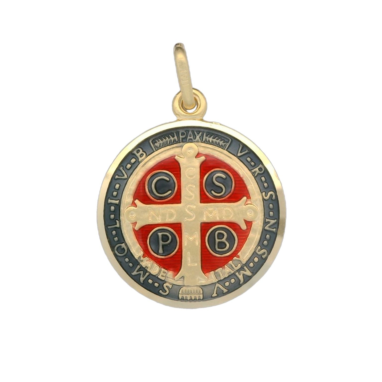 This solid gold miraculous medal is set in 18K yellow gold and is made in Italy. This miraculous medal is coined. This medal features enameling. The front of this medal is engraved with the Latin phrase 'eivs in obitv nro prae sentia mvniamvr' which translates in English to 'May we be strengthened by his presence in the hour of our death.' The back of this medal features the letters C S P B which signify Crux S. Patris Benedicti - which means 'Cross of Holy Father Benedict.'