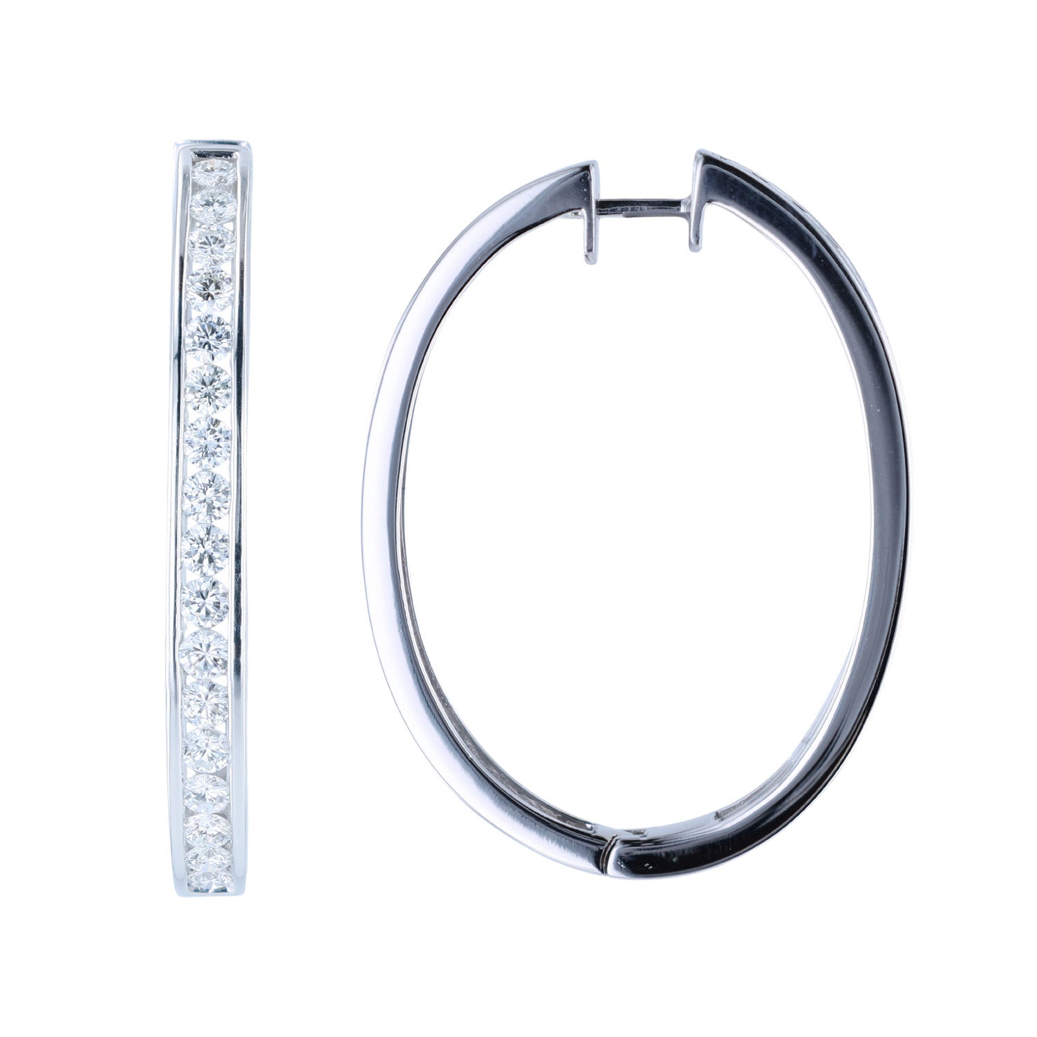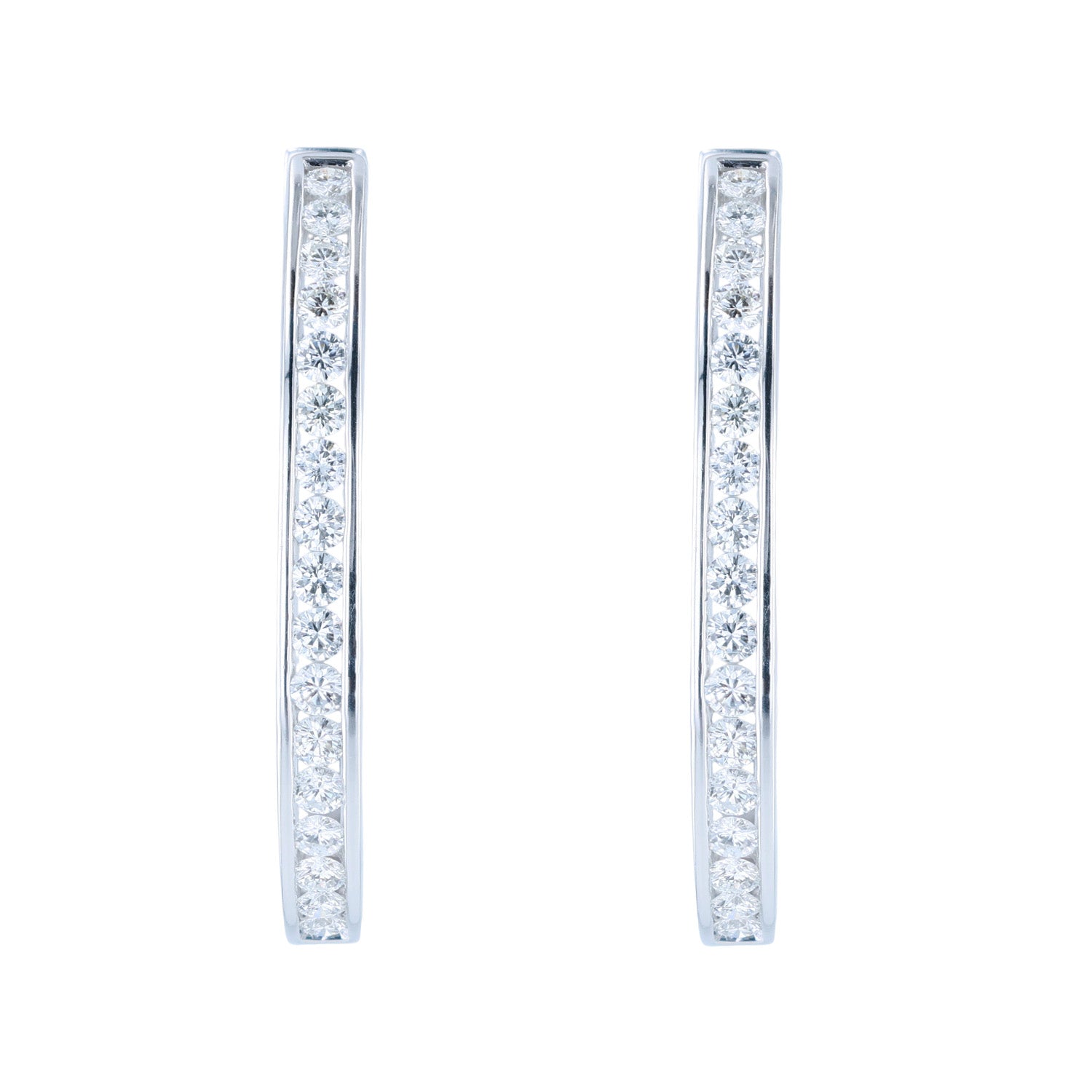 From the Bella Cosa Jewelers estate collection. This pre-owned pair of diamond hoop earrings have been set in 14K white gold. This pair of diamond earrings feature 2.01 carats of diamonds that are G to H in color and SI1 to SI2 in clarity. Diamond weights are estimated.
