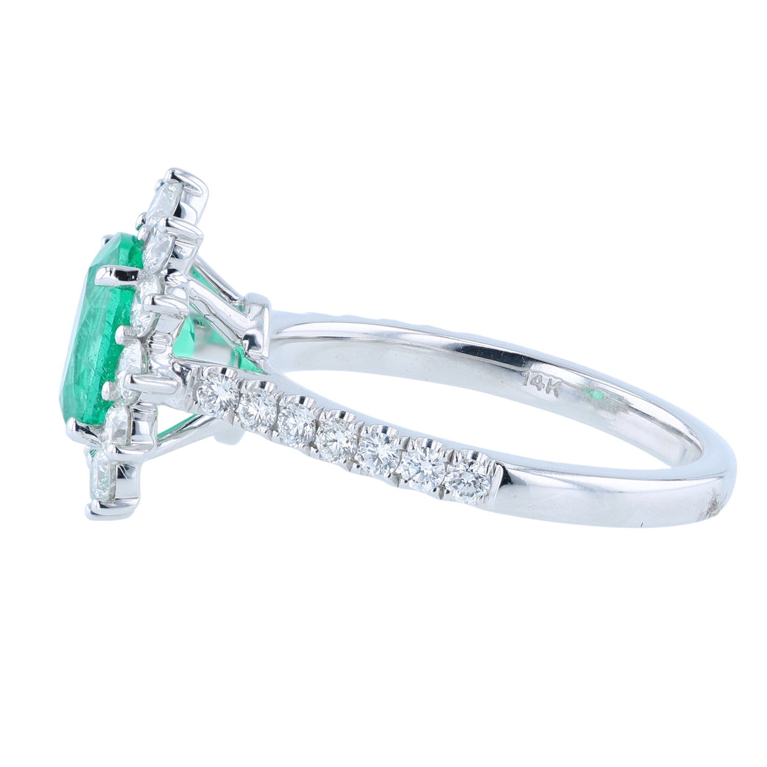 This sparkling emerald and diamond ring has been set in 14K white gold.