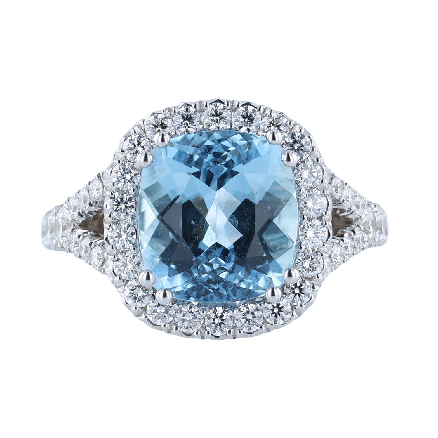 From the Bella Cosa Jewelers custom collection. This sparkling aquamarine and diamond ring was designed to stand out. This ring features a 3.48 carat aquamarine center and 0.97 carats of diamonds that are F to G in color and SI1 to SI2 in clarity. This aquamarine and diamond ring has been set in 18K white gold and measures a size 6.75.