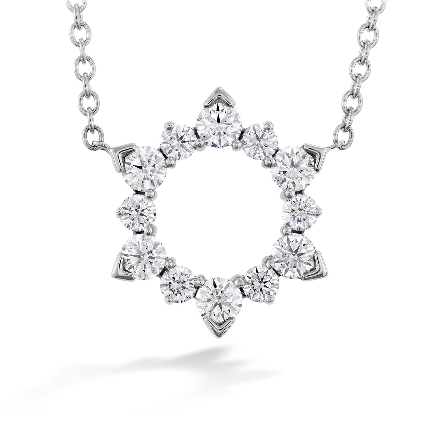 For a look that truly radiates, the Aerial Eclipse Pendant is the perfect choice. The illusion of a sun is created in this timeless, yet fashionable diamond necklace, making it an easy style to wear alone of layered with other diamond pendants.