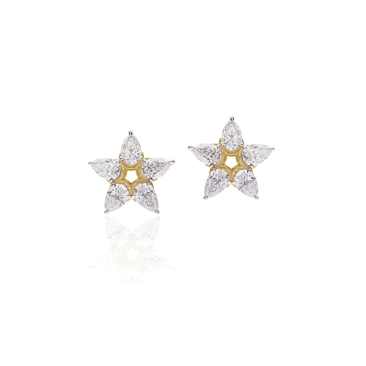 Ten pear-shape diamonds are hand-set in the finest platinum, cuddled by 18k yellow gold to create these stunning flower studs. Their lightweight construction ensures a pleasant wearing experience, making them suitable for everyday wear or special events. Each pear shape diamond comes with its own GIA certificate and colorless grading.