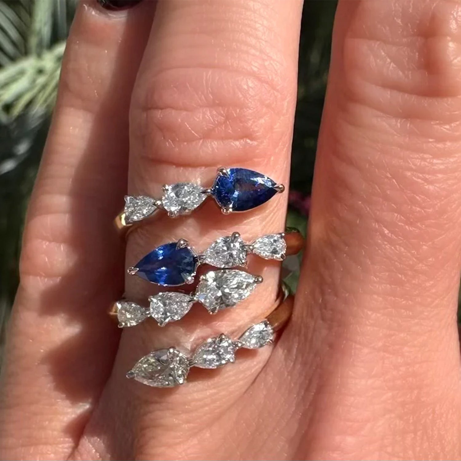 A tapered row of pear-shaped diamonds crosses the finger, finishing in a vibrant pear-shaped sapphire. The contrast in color and form draws the eye, giving the piece a clean, modern edge.