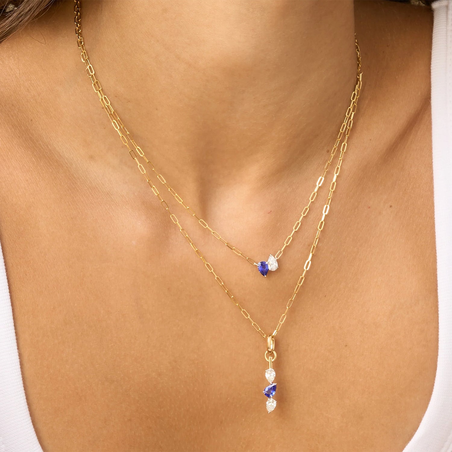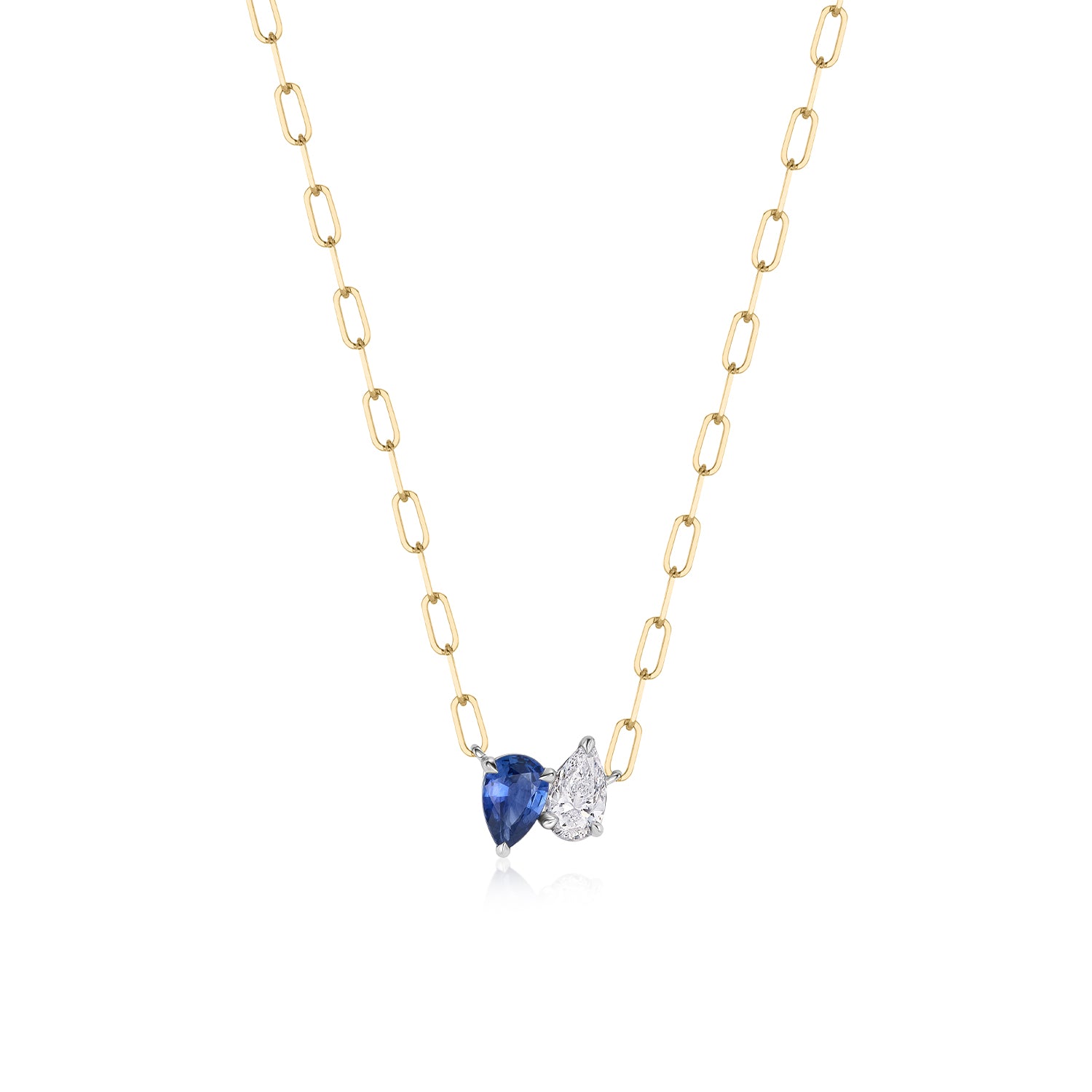 A vivid blue sapphire and a white diamond, each pear-shaped set in platinum prongs, rest in opposing directions along a polished 18k yellow gold chain. Delicate by design, made for effortless, everyday wear—on its own or softly layered.