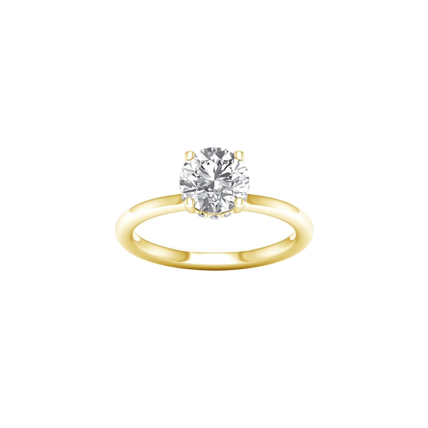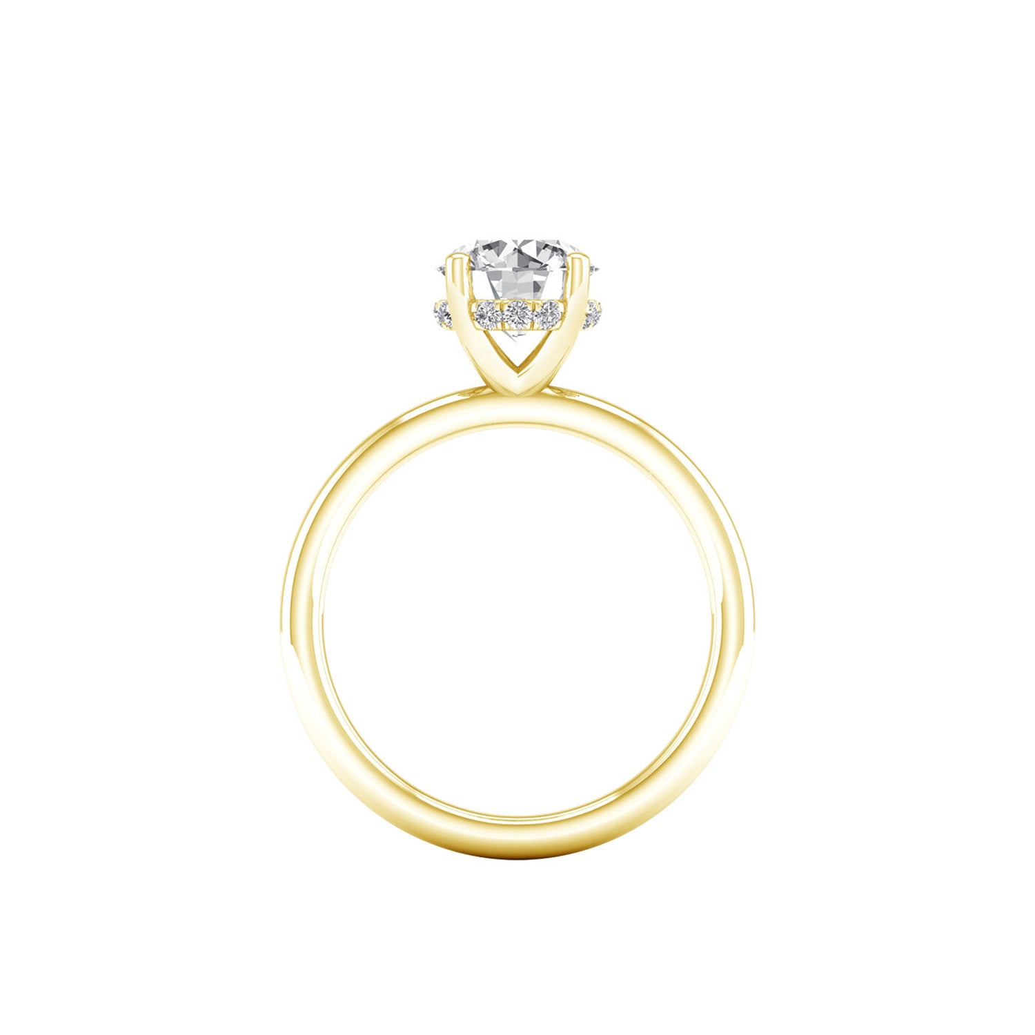 This lab-grown diamond hidden halo engagement ring has been expertly crafted in 14K yellow gold.