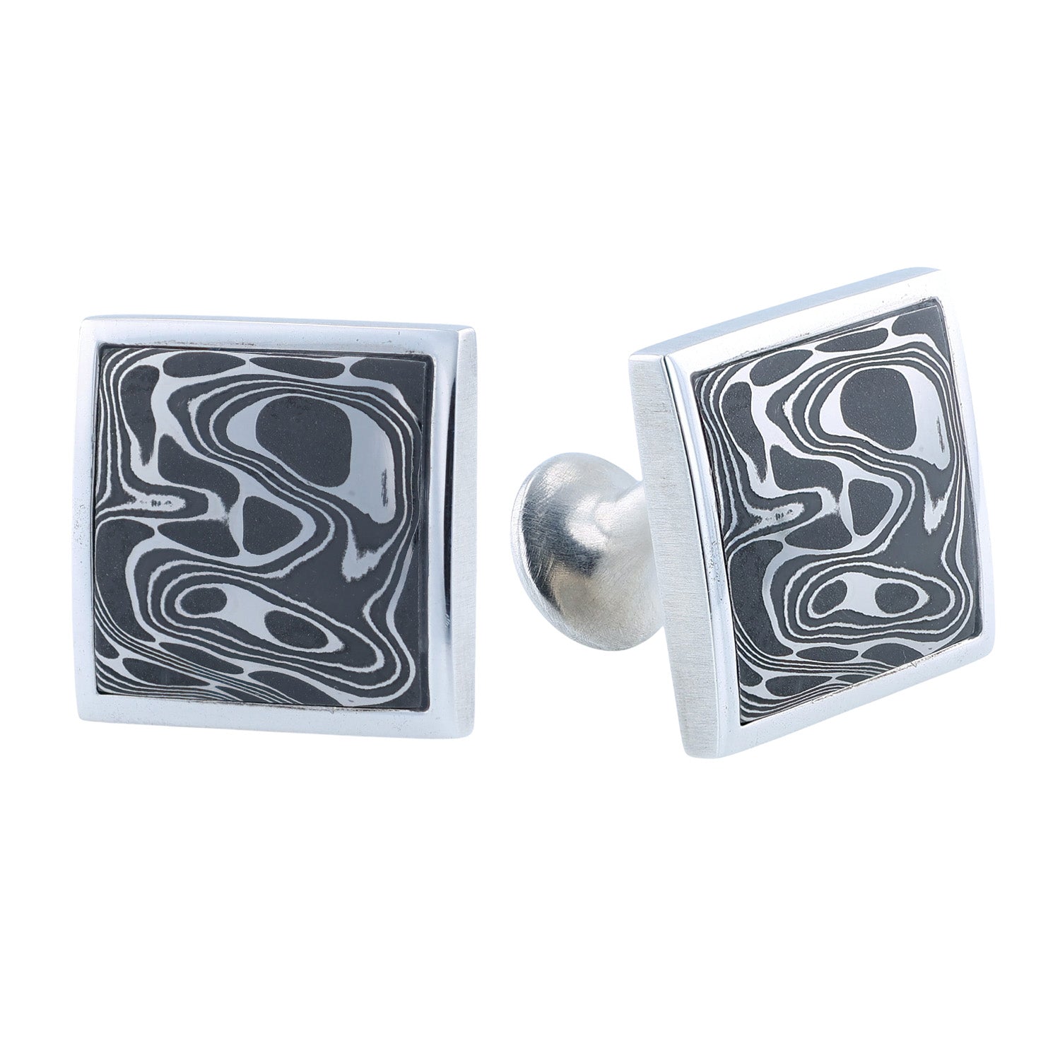 The Damascus Duo cufflinks are crafted from sterling silver with a powerful design that puts some weighted style on your sleeves. The inlays are hand-forged 'Intrepid' damascus by Chad Nichols. Metal on metal, in a bold yet understated contrast.