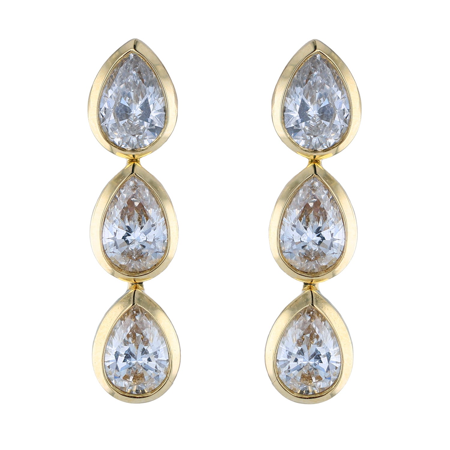 This sparkling pair of diamond drop earrings feature 1.83 carats of pear-shape diamonds that are F to G in color and VVS to VS in clarity. This pair of diamond earrings have been set in 18K yellow gold and have a friction back closure.