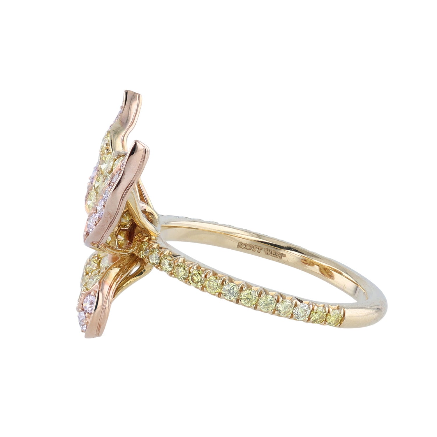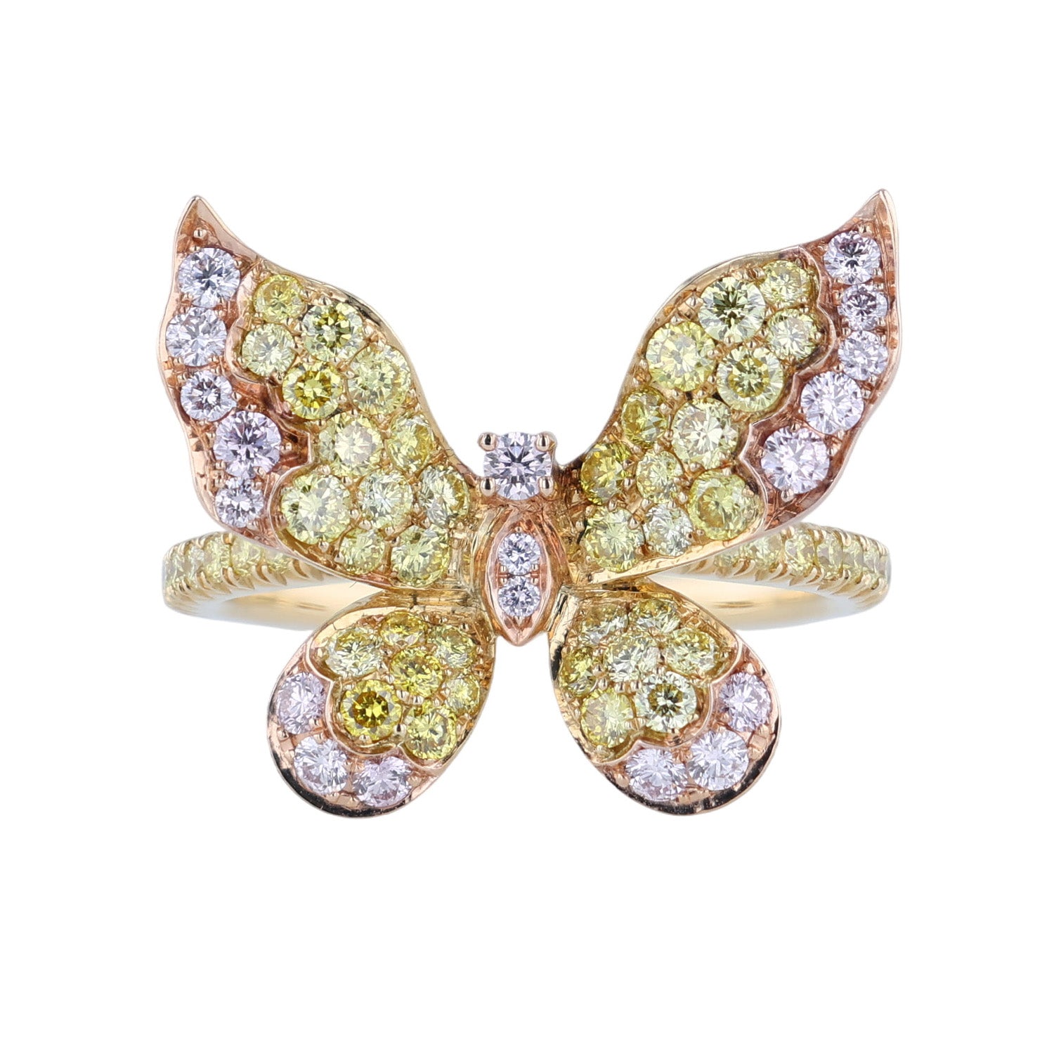 This sparkling diamond ring features 0.30 carats of Argyle fancy pink diamonds and 0.99 carats of fancy intense yellow diamonds. This diamond butterfly ring has been set in 18K yellow gold and 18K rose gold and measures a size 6.5.
