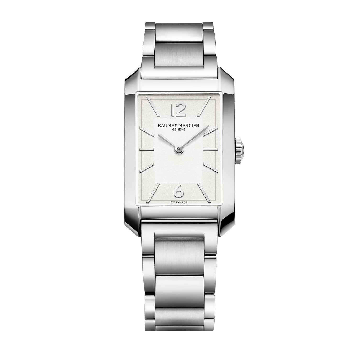 This quartz timepiece balances urban style with excellence in watchmaking. It comes with an opaline white dial and grey minute line. The sleek rectangular stainless steel case is complemented by an interchangeable integrated 3-row polished and satin-finished stainless steel bracelet.