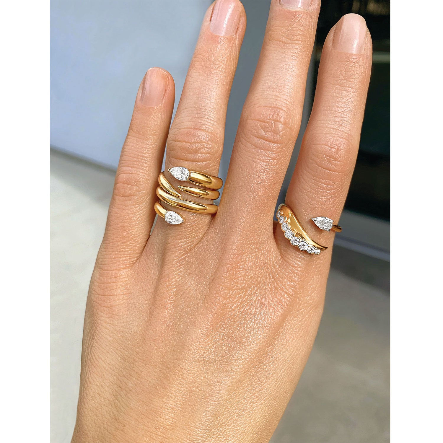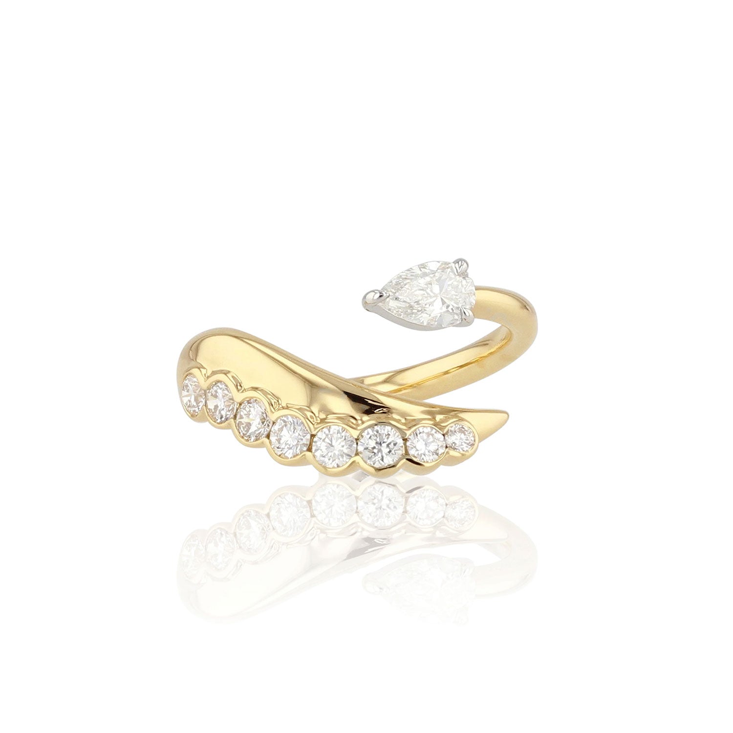 It features a Pear-shaped GIA Certified Diamond at the top and a mesmerizing pattern of eight round diamonds below, hugged by the 18K yellow gold band. The elevated top ensures the pear-shaped diamond takes center stage, while the gold band flows around the round diamonds, creating captivating fluidity and movement.