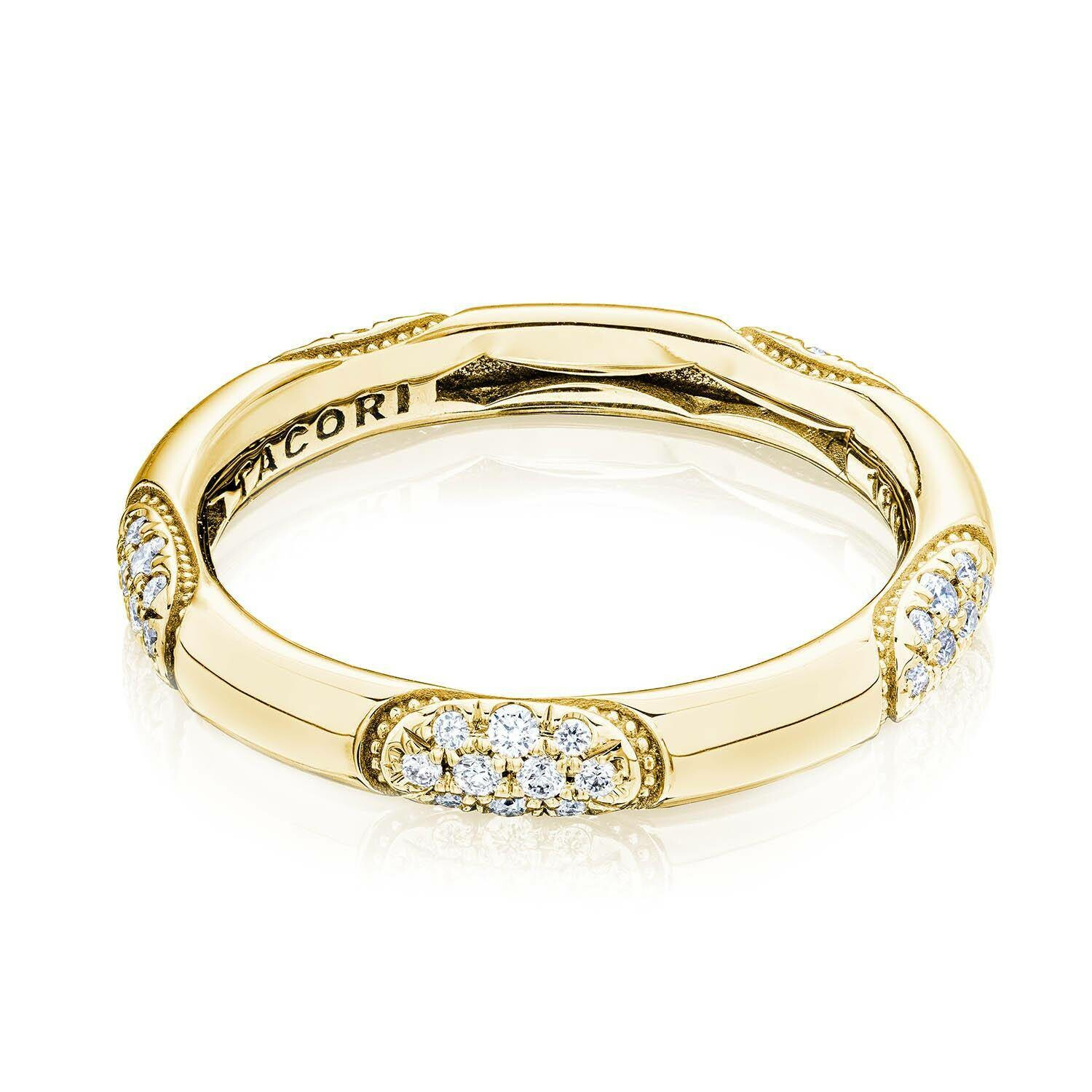 A high polish 18K Yellow Gold ring is adorned with pavé-set round brilliant diamonds and hand-hewn milgrain that form meticulous TACORI Crescents.