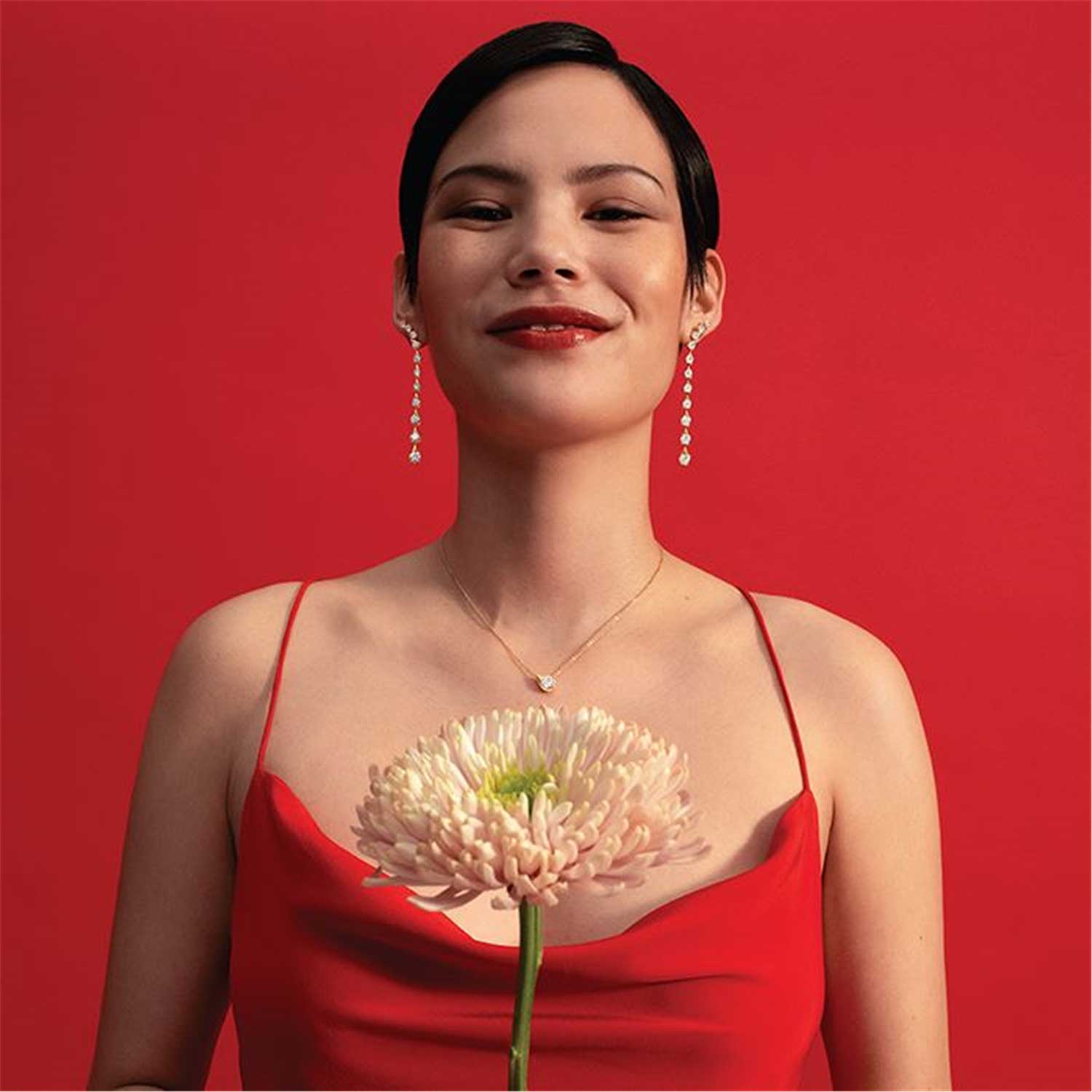 The LU Droplet Pendant sits delicately on the decolletage like a sparkling drop of water, exhaling light and creating a magical moment that makes the wearer feel powerful and alive.